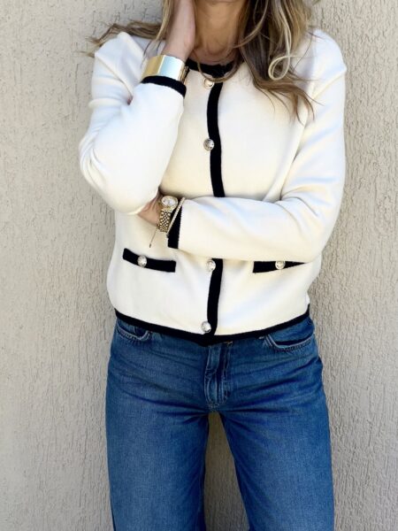 Κομψή πλεκτή ζακέτα σε εκρού απόχρωση με μαύρες contrast λεπτομέρειες που χαρίζουν διαχρονικό parisian χαρακτήρα. Η στρογγυλή λαιμόκοψη, τα διακοσμητικά κουμπιά και οι minimal τσέπες δημιουργούν ένα refined και θηλυκό αποτέλεσμα, ιδανικό για elegant καθημερινές εμφανίσεις. Η ίσια γραμμή της αγκαλιάζει όμορφα το σώμα χωρίς να βαραίνει, ενώ η απαλή […]