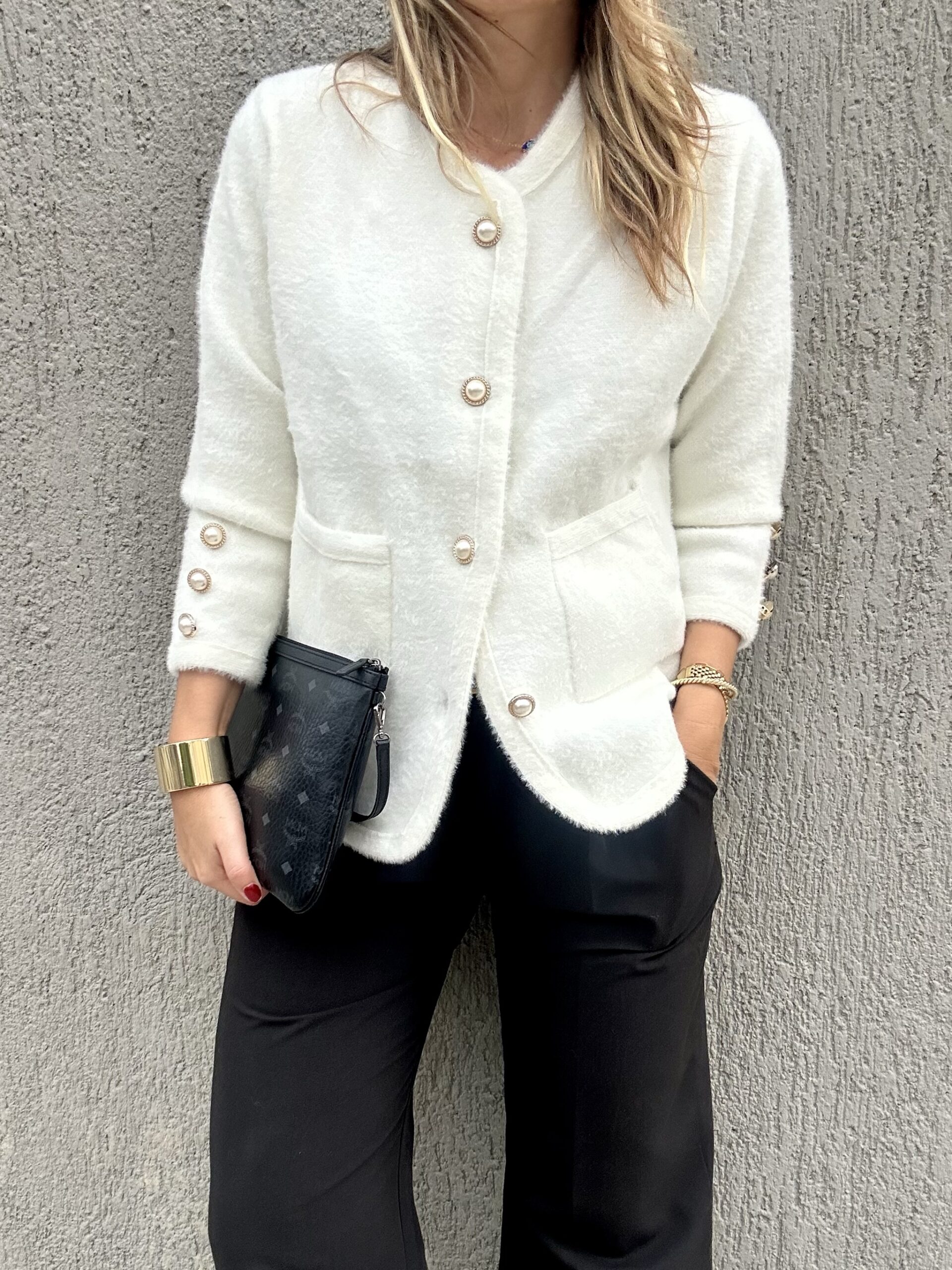 Ζακέτα σε ιβουάρ απόχρωση με μαλακή υφή και κουμπιά-μαργαριτάρια στο μπροστινό μέρος και στα μανίκια. Διαθέτει δύο μπροστινές τσέπες και ελαφρώς boxy γραμμή που χαρίζει κομψότητα και άνεση. Ιδανική για elegant εμφανίσεις ή για να αναβαθμίσει ένα απλό outfit.