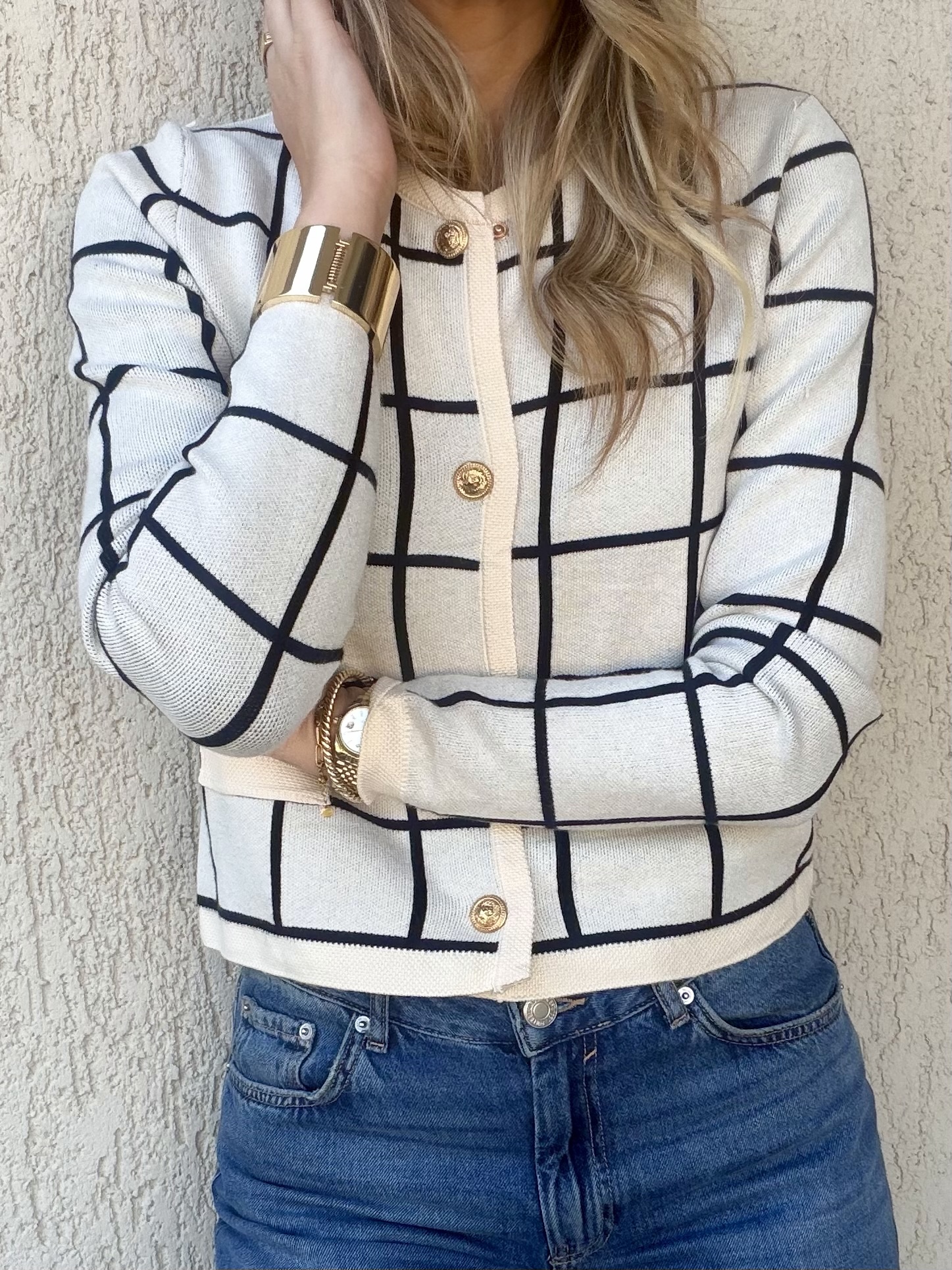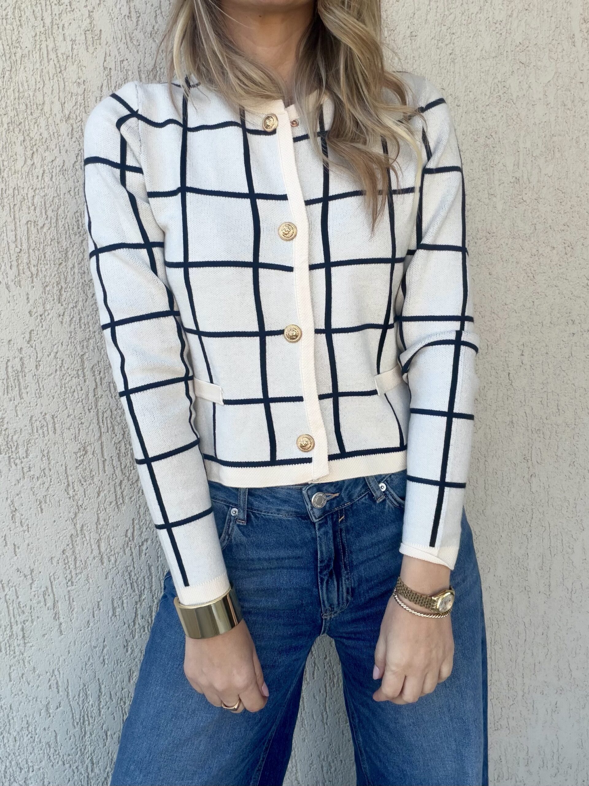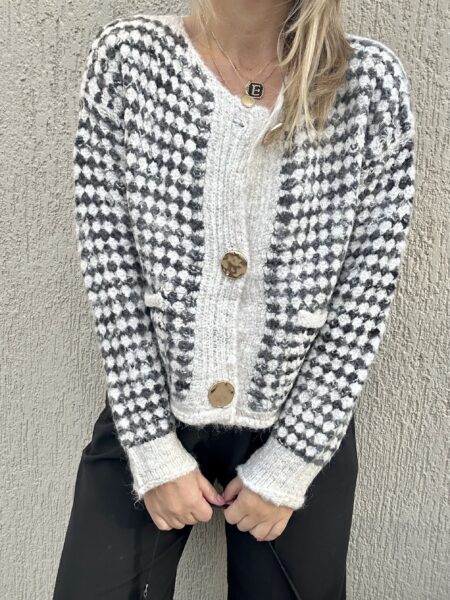 Κομψή πλεκτή ζακέτα σε εκρού απόχρωση με διακριτικό grid σχέδιο σε μαύρο που χαρίζει parisian χαρακτήρα και μοντέρνα αισθητική. Η καθαρή γραμμή της και τα χρυσά κουμπιά δημιουργούν ένα refined αποτέλεσμα, ενώ το κοντό μήκος της την καθιστά ιδανική για συνδυασμούς με ψηλόμεσα παντελόνια ή denim.