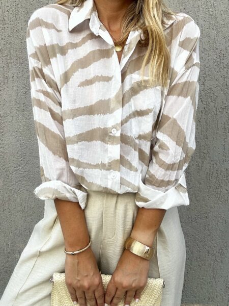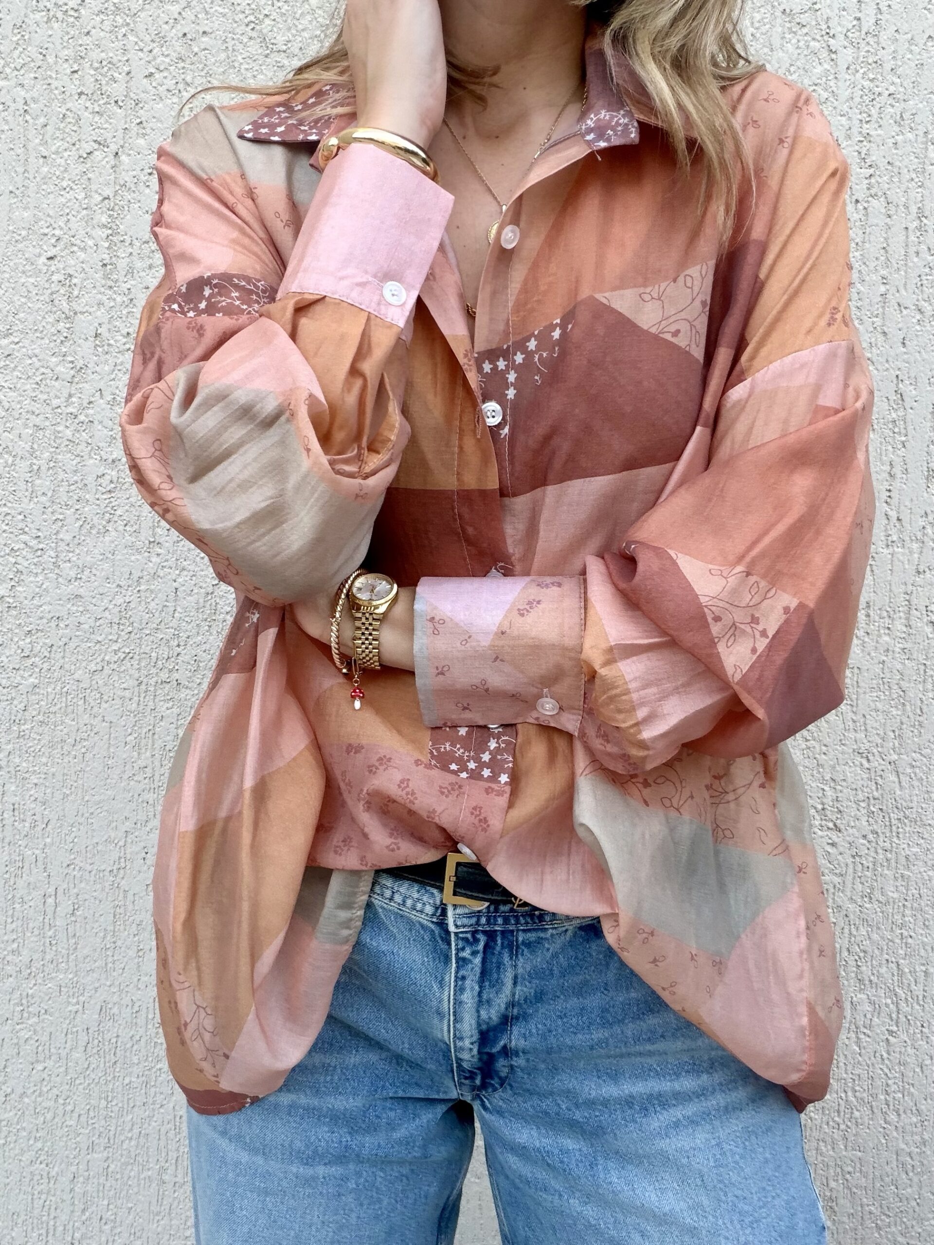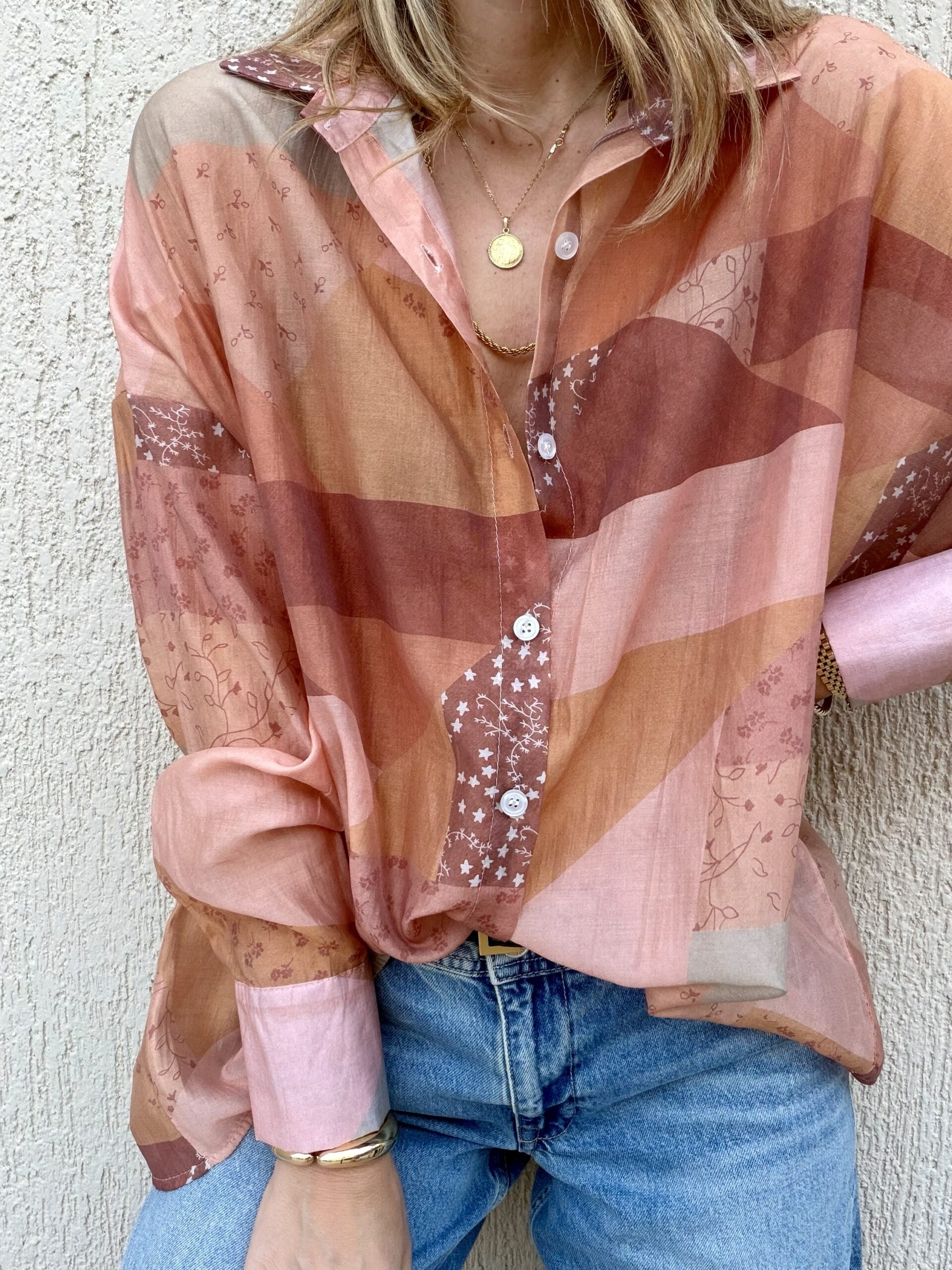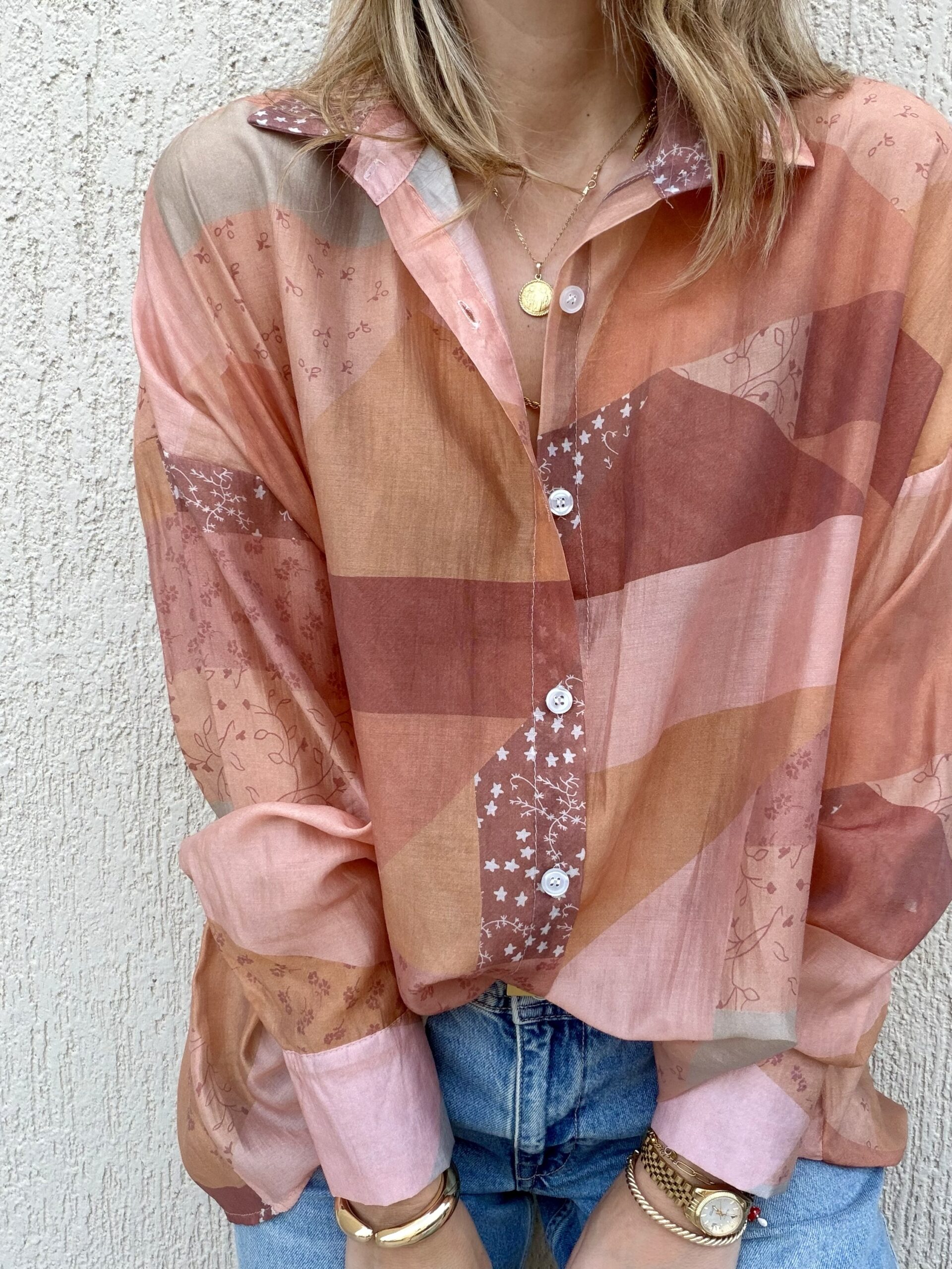 Αέρινο πουκάμισο με ιδιαίτερο mix από μοτίβα σε αποχρώσεις ροζ, terracotta και nude, που δημιουργούν ένα μοναδικό, καλλιτεχνικό αποτέλεσμα.