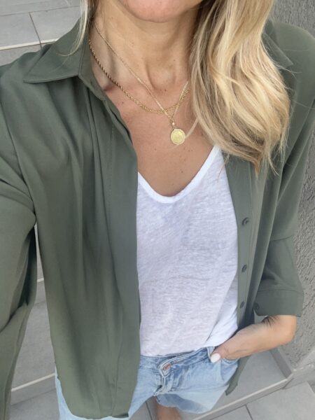 Το ύφασμα είναι ελαφρύ και ημιδιάφανο, με ανάλαφρη κίνηση που αγκαλιάζει το σώμα και δημιουργεί elegant αποτέλεσμα. Διαθέτει γιακά και μακρύ μανίκι, ενώ μπορεί να φορεθεί είτε κανονικά είτε με χαλαρό δέσιμο μπροστά για πιο ιδιαίτερο styling.