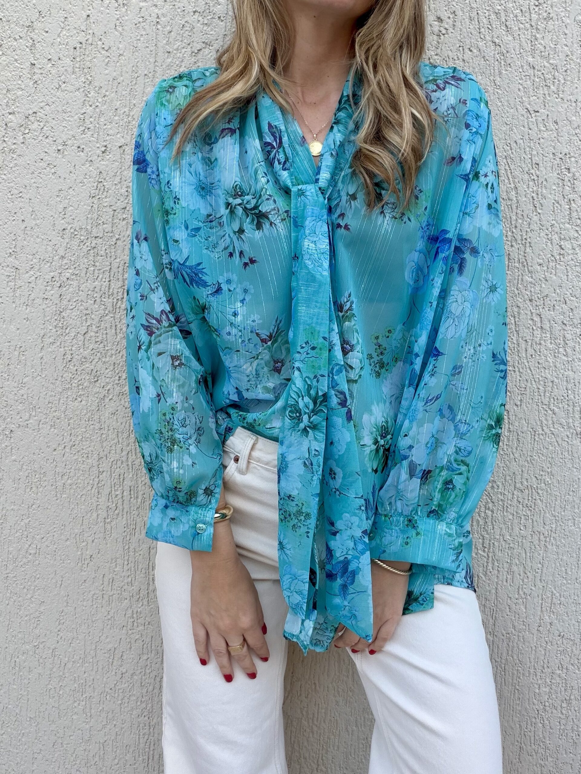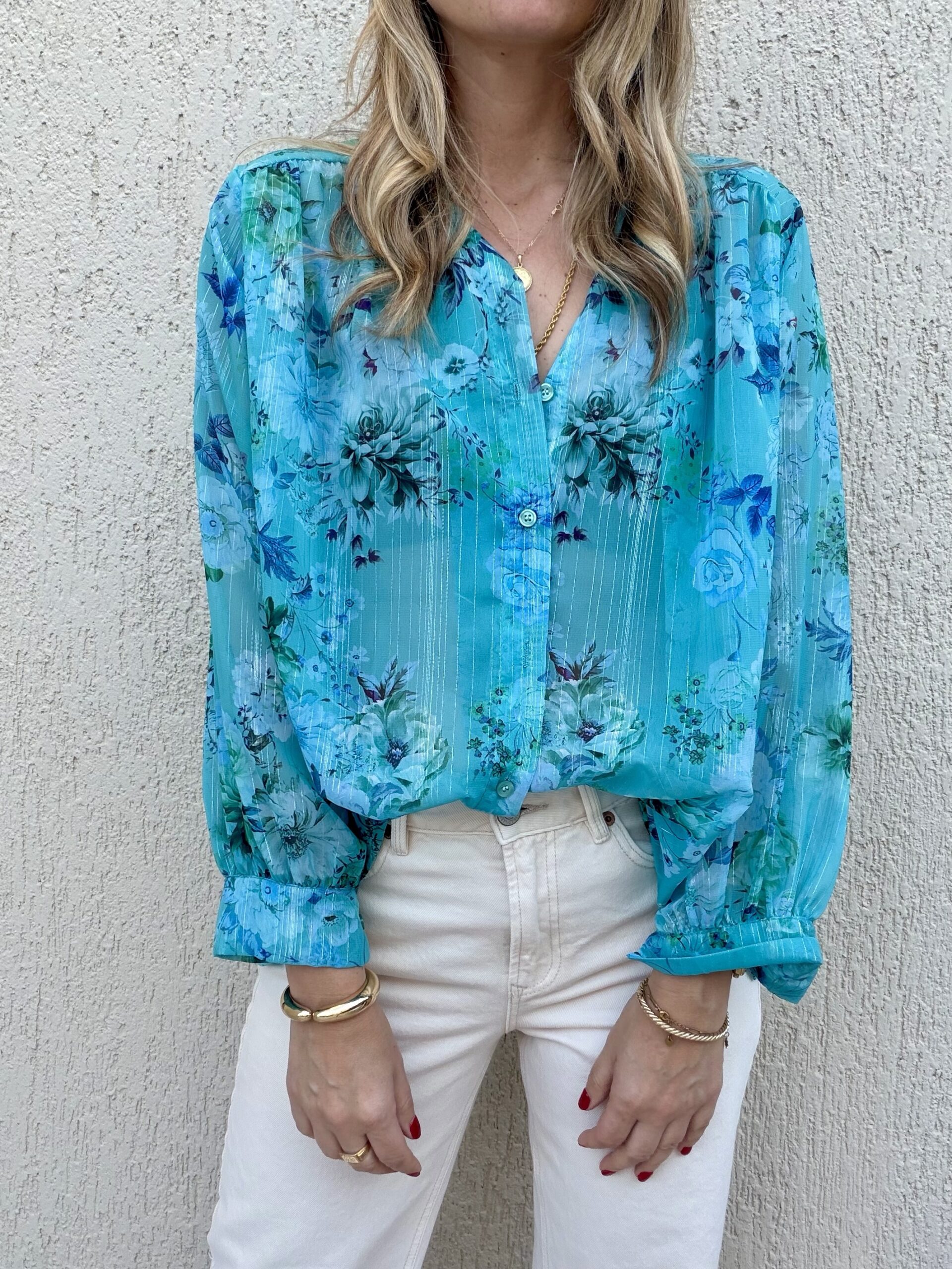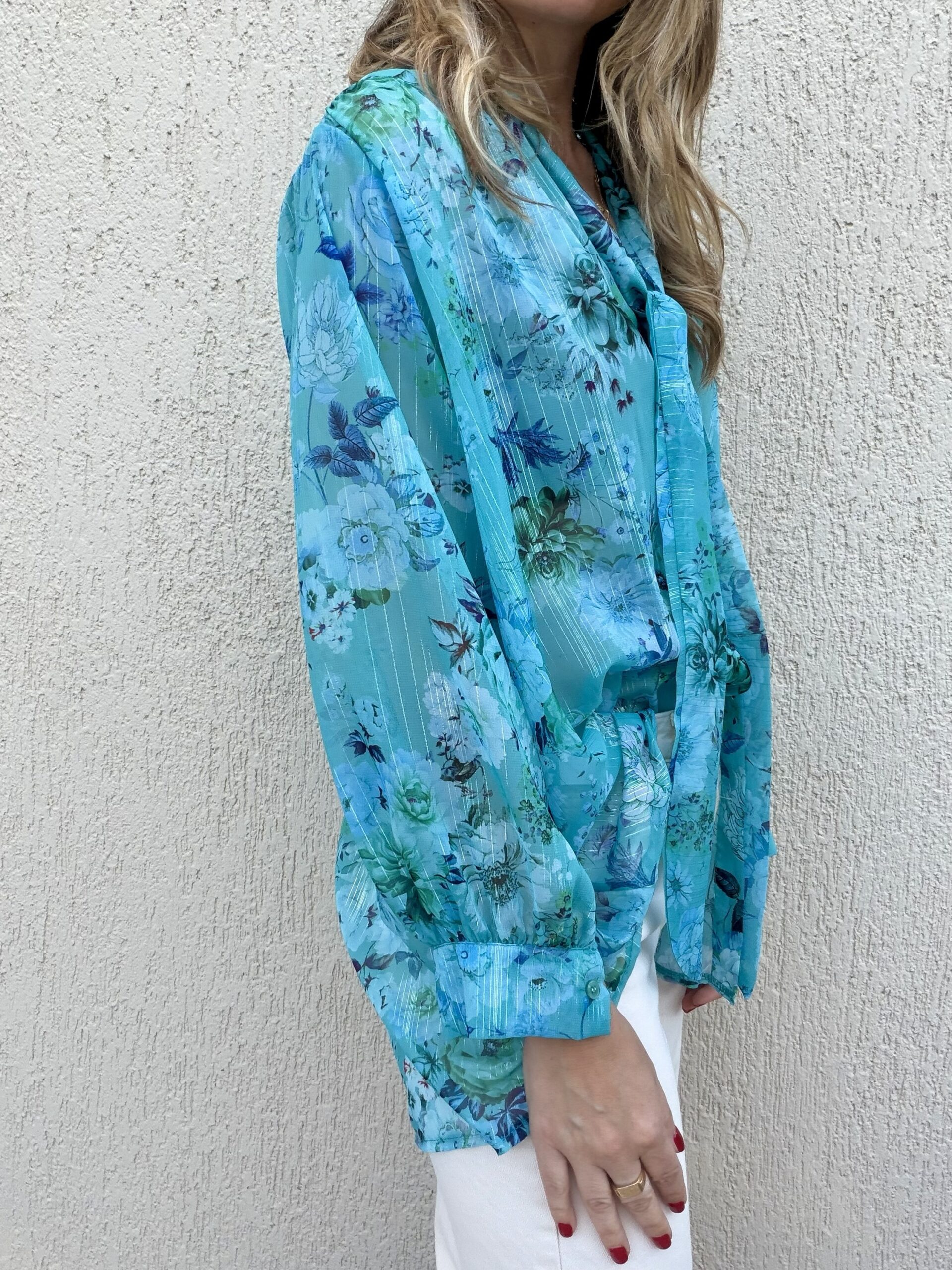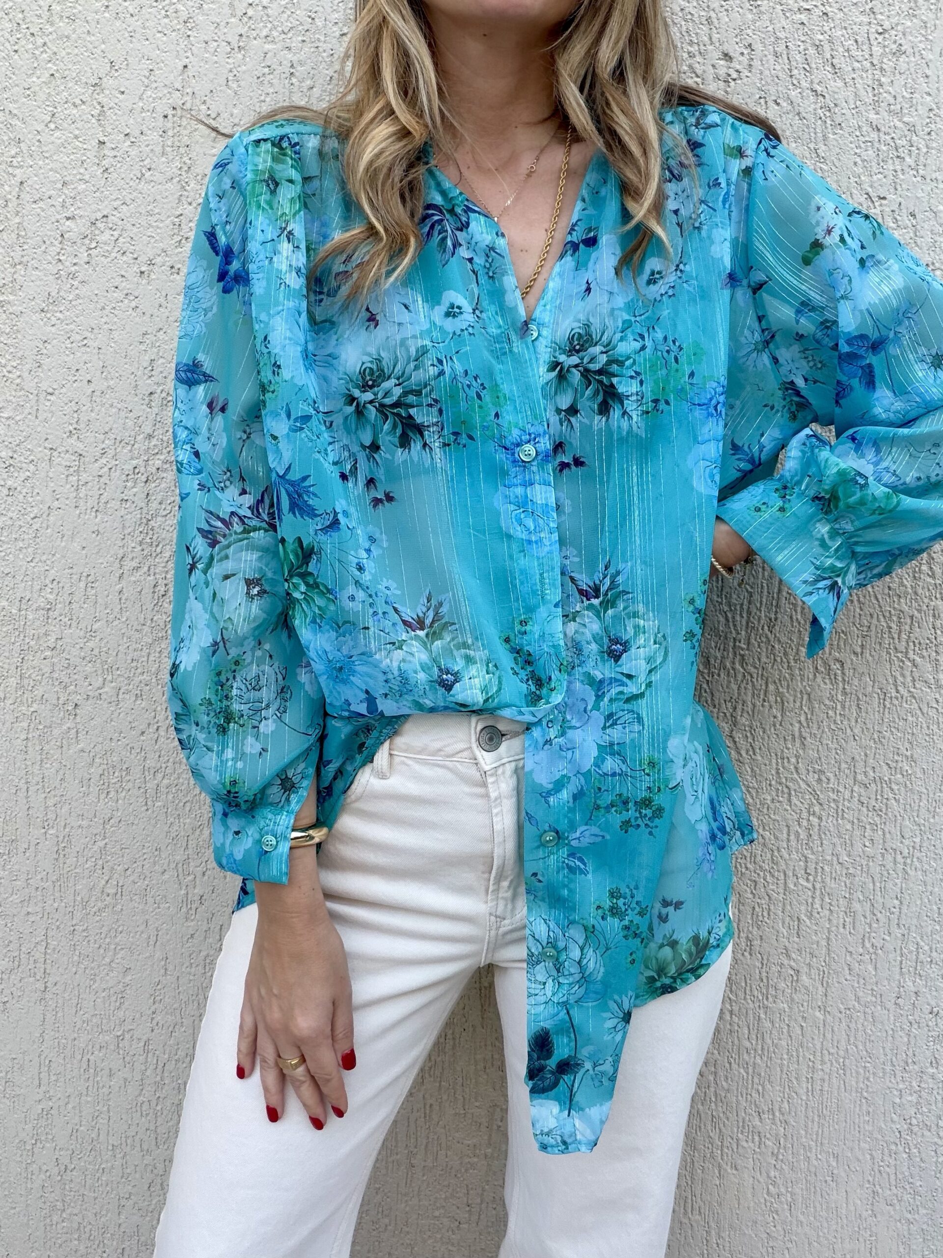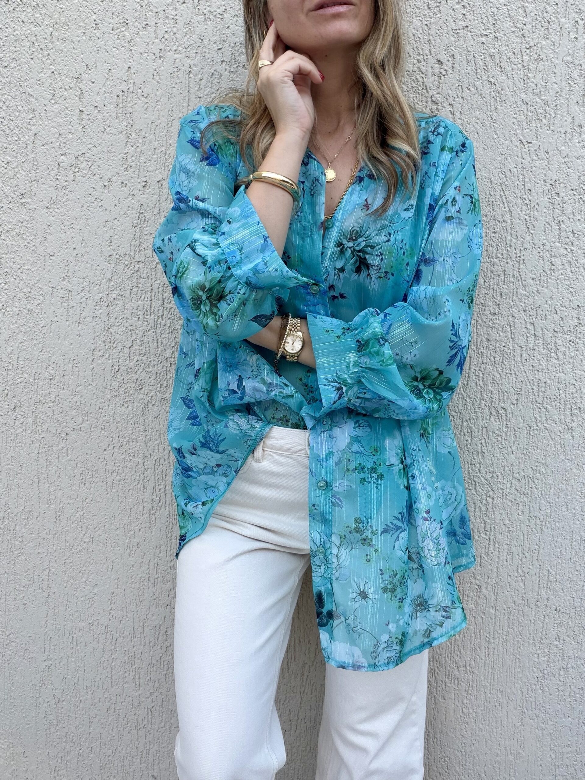 Αέρινο πουκάμισο σε εντυπωσιακή απόχρωση turquoise, με διακριτικό floral σχέδιο που δίνει θηλυκότητα χωρίς να γίνεται φορτωμένο.