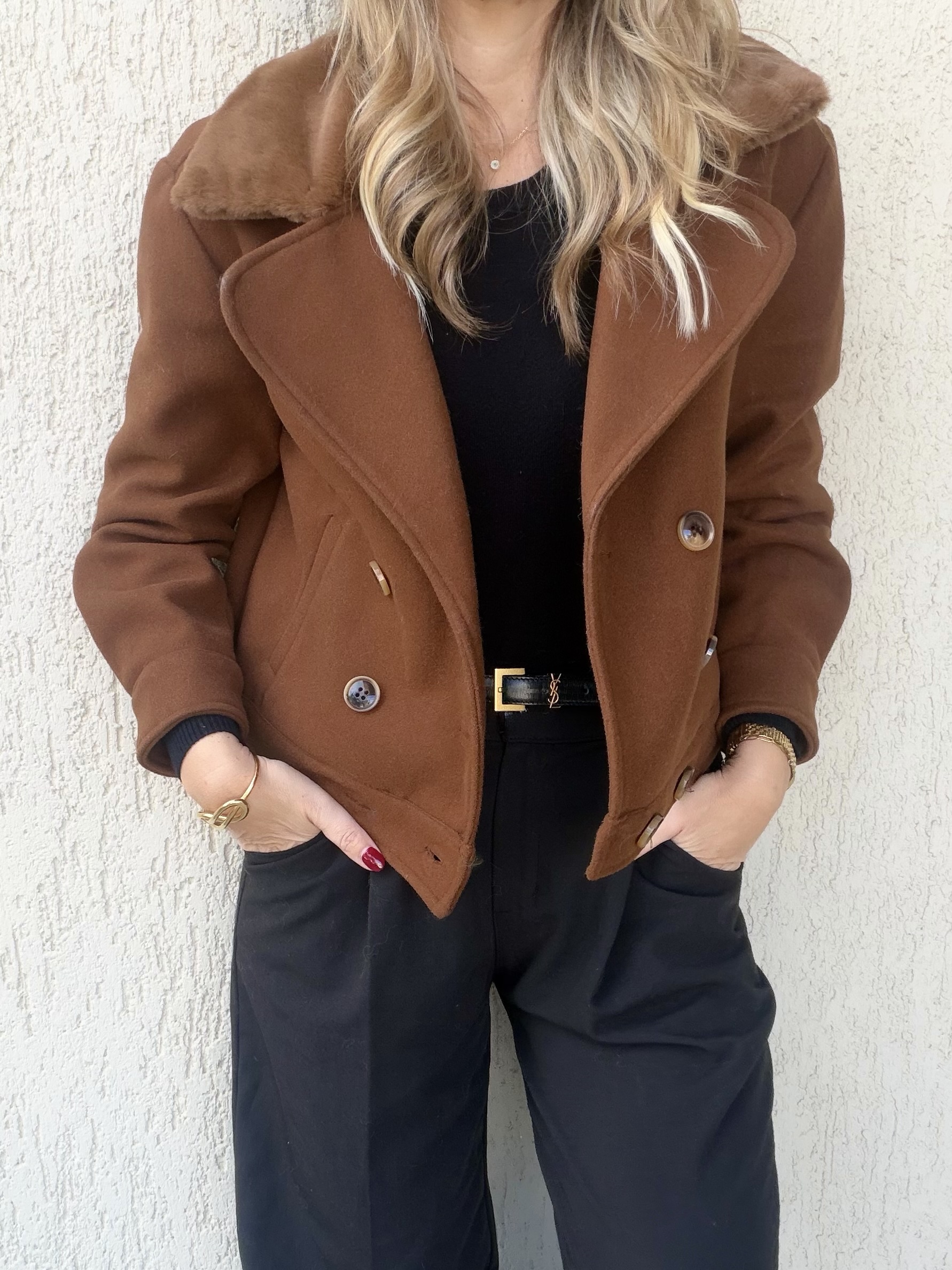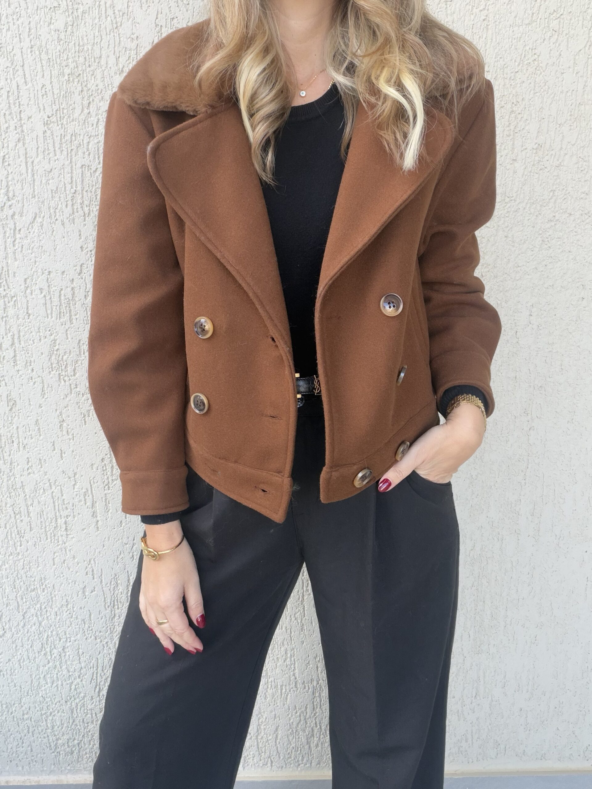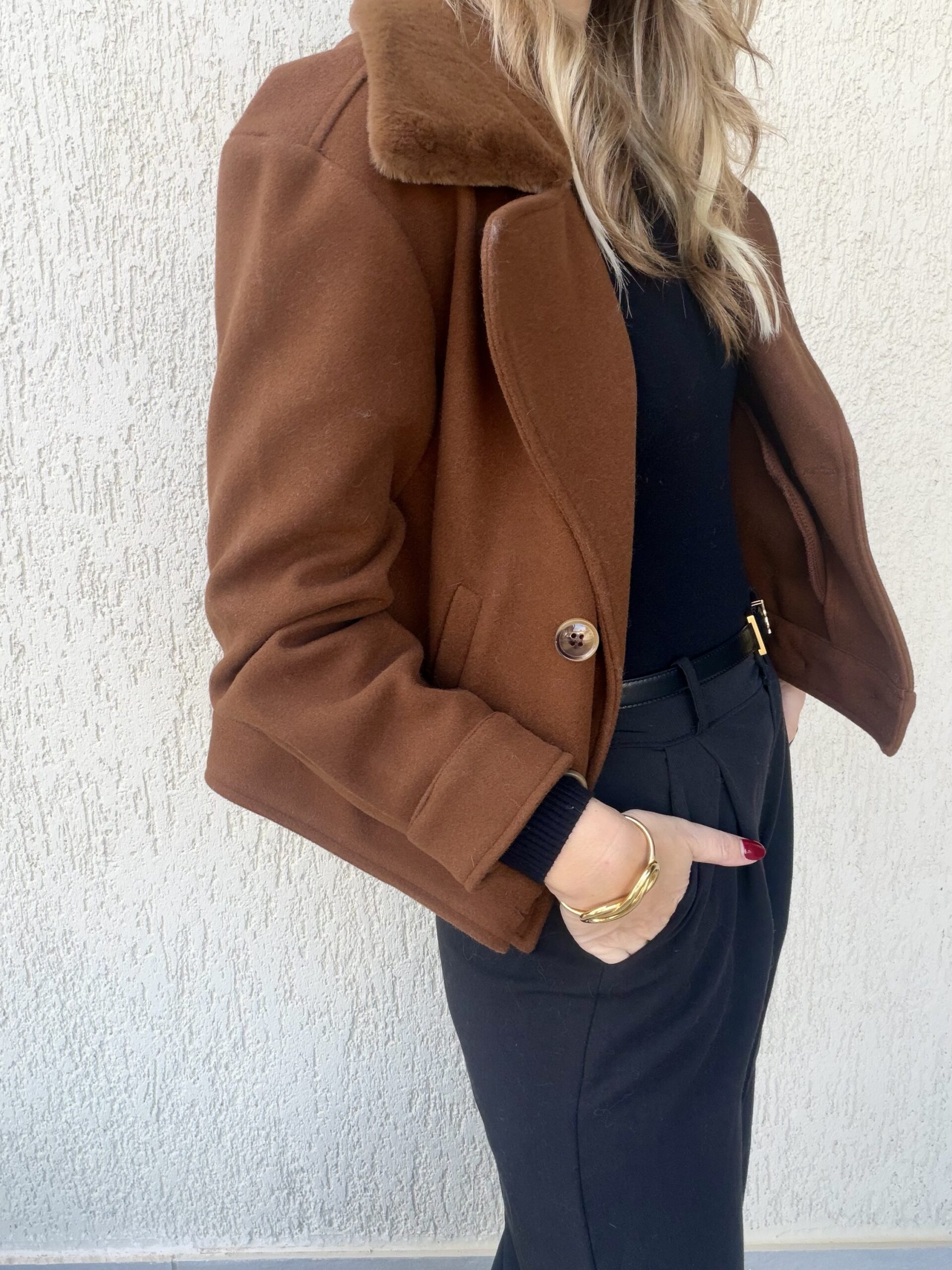 Κομψό κοντό παλτό με classic γραμμή και ζεστή, πολυτελή υφή. Ο διπλός γιακάς με απαλή επένδυση προσθέτει διακριτική ένταση στο design, ενώ το σταυρωτό κούμπωμα χαρίζει διαχρονικό χαρακτήρα και κομψή εφαρμογή.