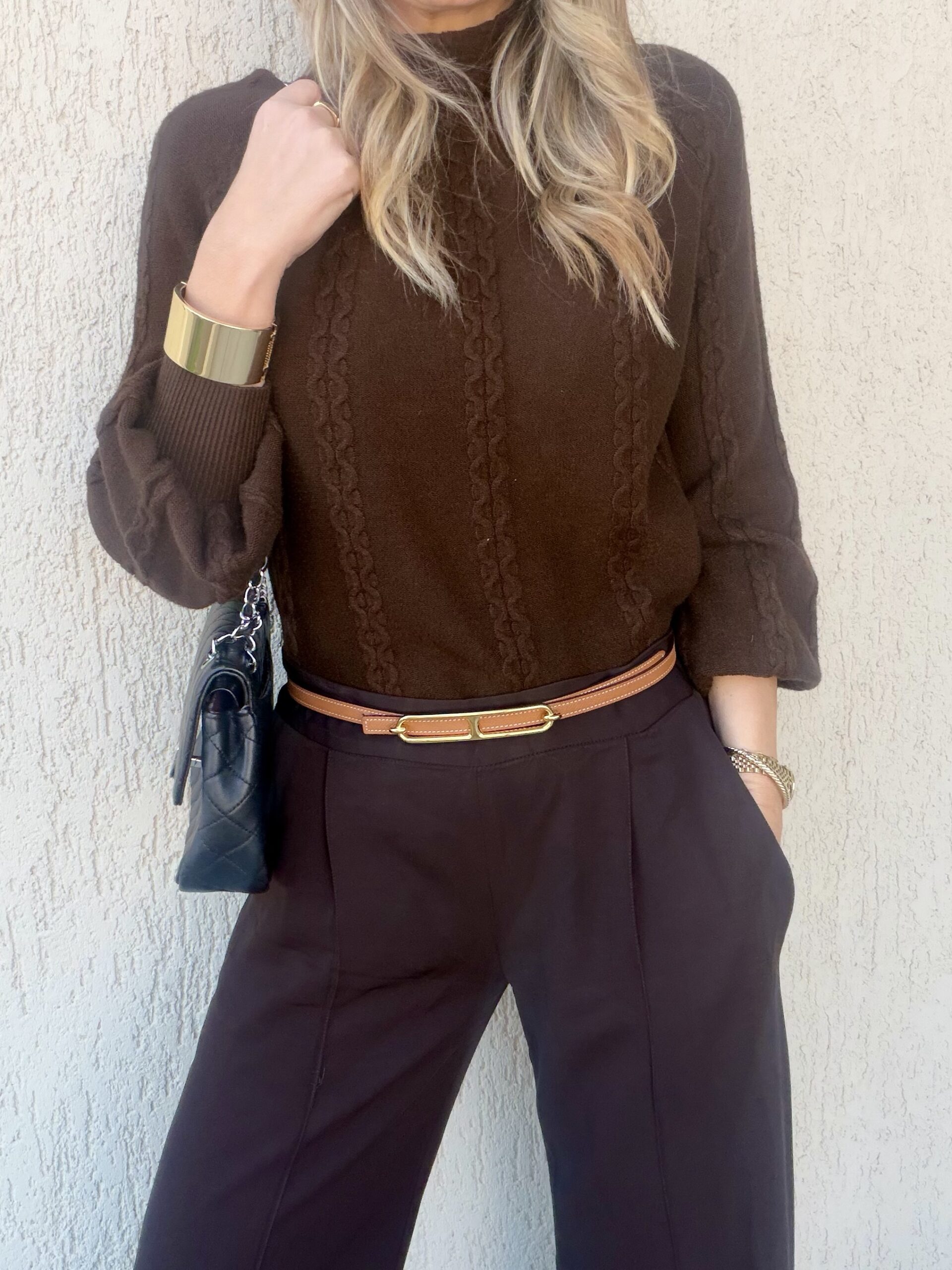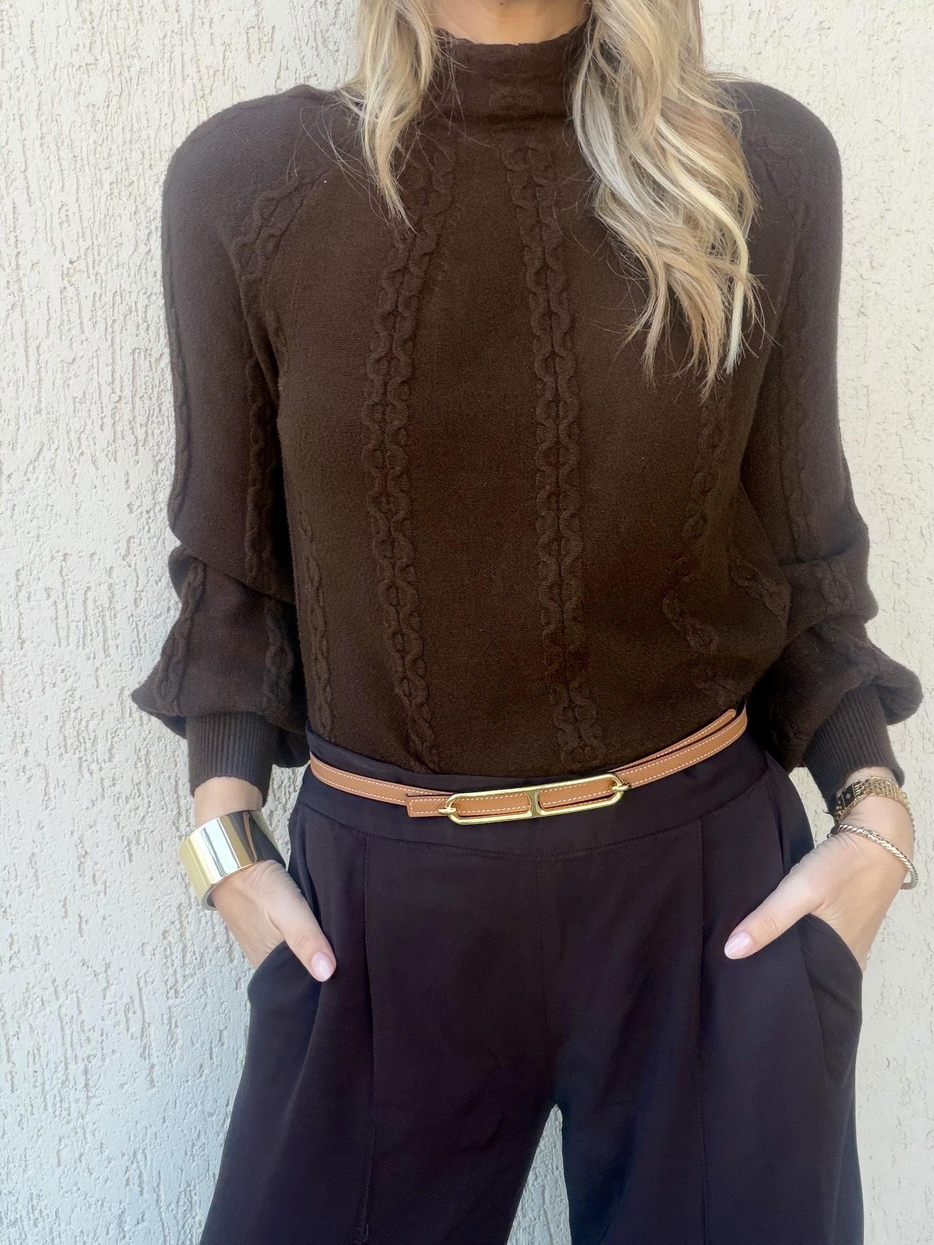 Διαχρονικό πλεκτό σε βαθιά chocolate απόχρωση με elegant cable πλέξη που χαρίζει υφή και πολυτέλεια στο look. Ο ψηλός λαιμός αγκαλιάζει απαλά τον λαιμό, ενώ τα balloon μανίκια με rib τελείωμα προσθέτουν σύγχρονη θηλυκότητα και ισορροπούν άψογα με την εφαρμοστή γραμμή στο σώμα.