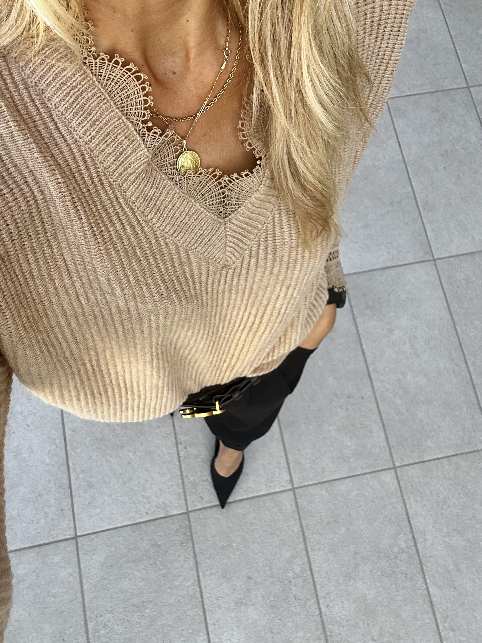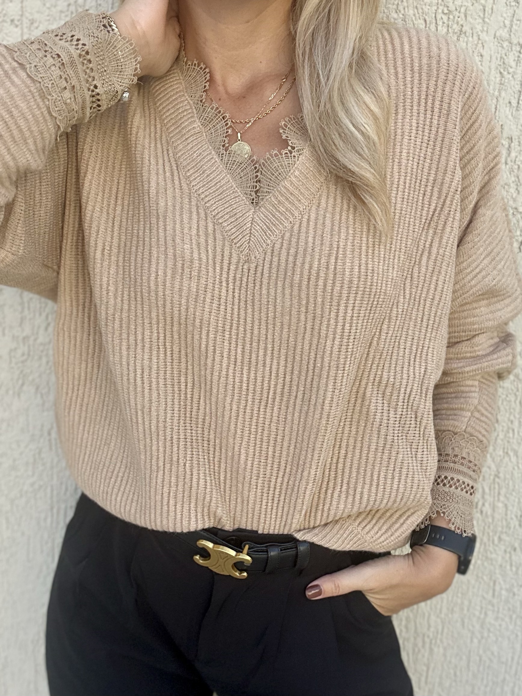 • Μονόχρωμο πουλόβερ. • Απαλή υφή. • Κανονική γραμμή Δαντέλα στα μανίκια και στο V