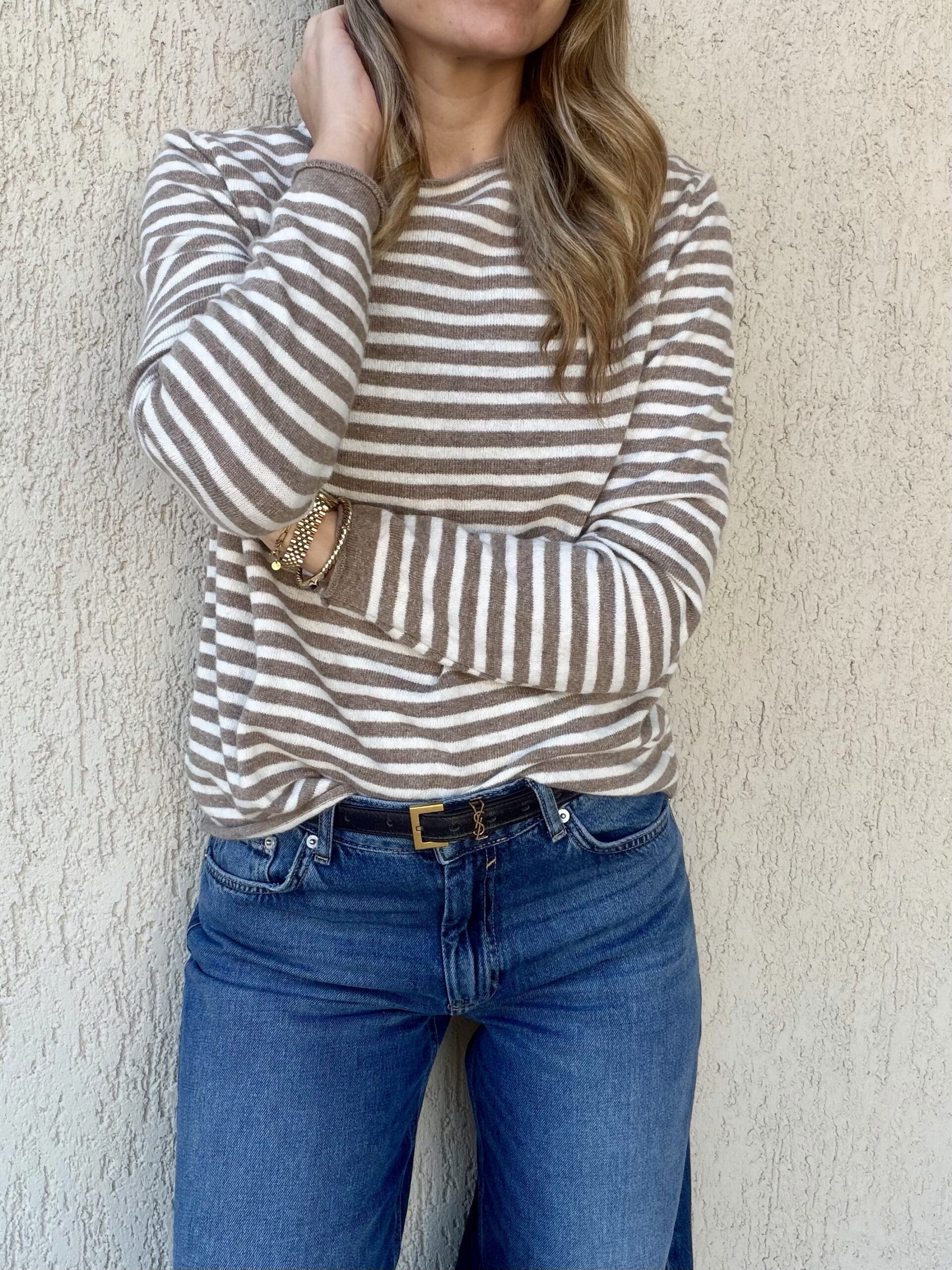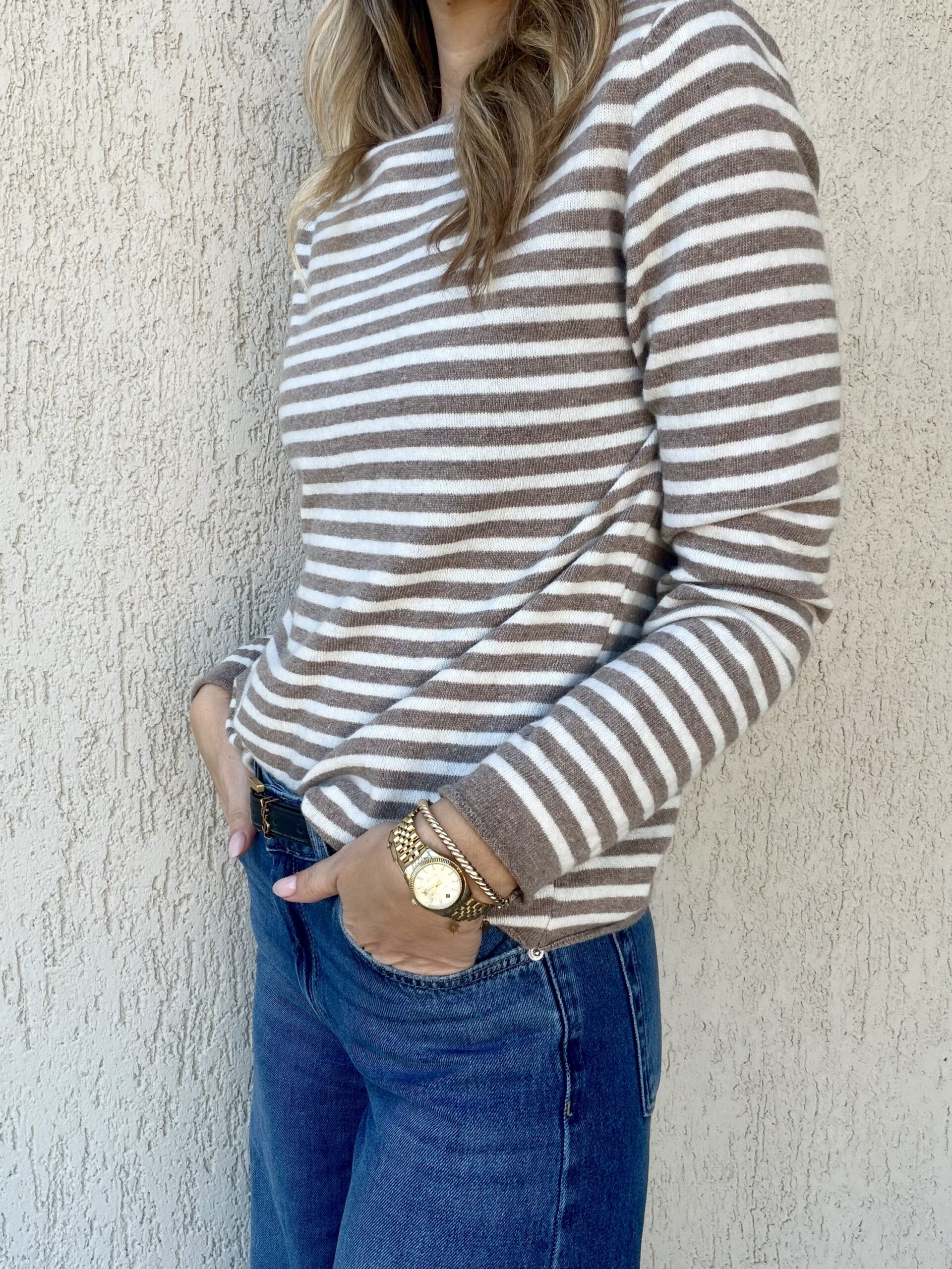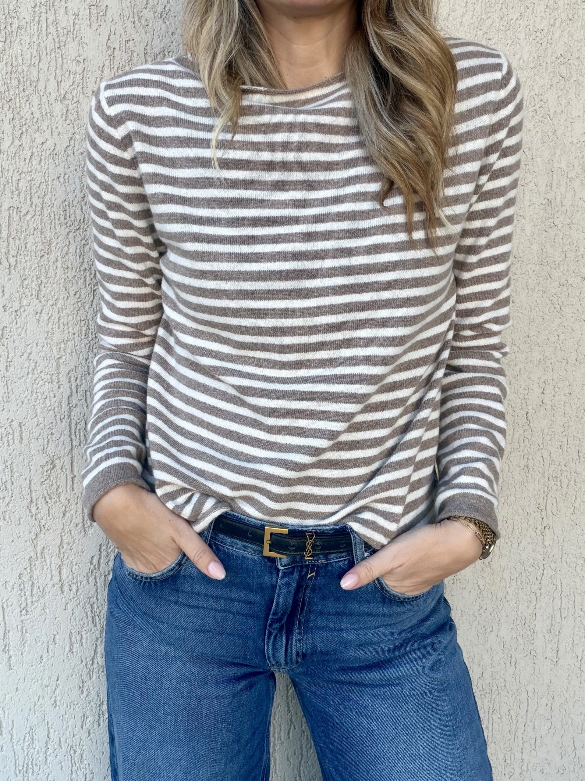 Απαλό ριγέ πλεκτό σε διαχρονικούς τόνους μπεζ και εκρού, ιδανικό για καθημερινά αλλά και πιο προσεγμένα looks. Έχει ίσια, άνετη γραμμή που φοριέται εύκολα μόνο του ή κάτω από σακάκι και πανωφόρια. Το ύφασμα είναι μαλακό και ελαφρύ, προσφέροντας άνεση όλη την ημέρα.