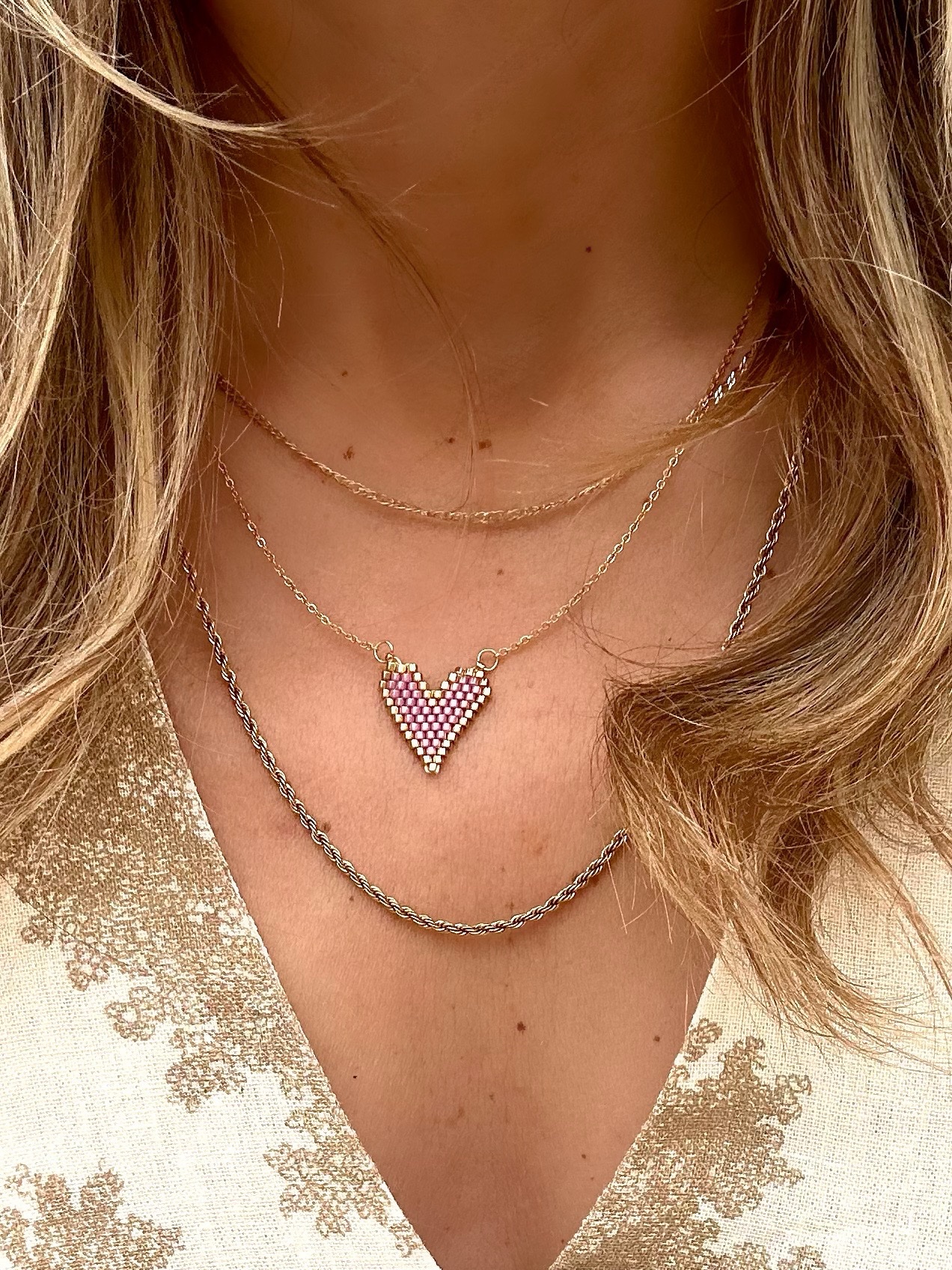 Το Heart Pink Necklace είναι μία λεπτεπίλεπτη αλυσίδα με ένα μοναδικό κεντρικό στοιχείο: καρδιά από ροζ χάντρες, φτιαγμένη με τεχνική που θυμίζει pixel art ή ψηφιδωτό. Το σχέδιο είναι ρομαντικό αλλά σύγχρονο.