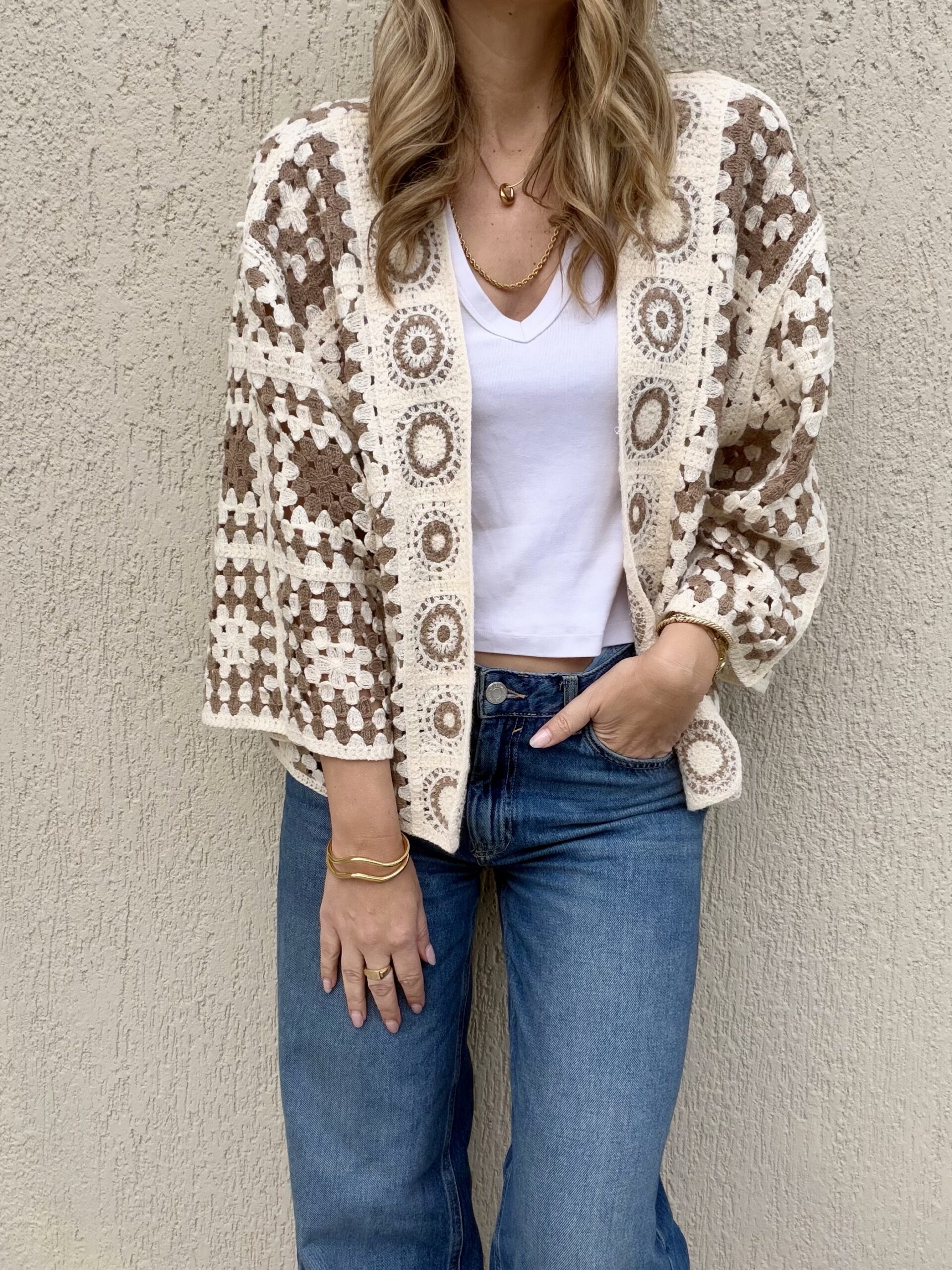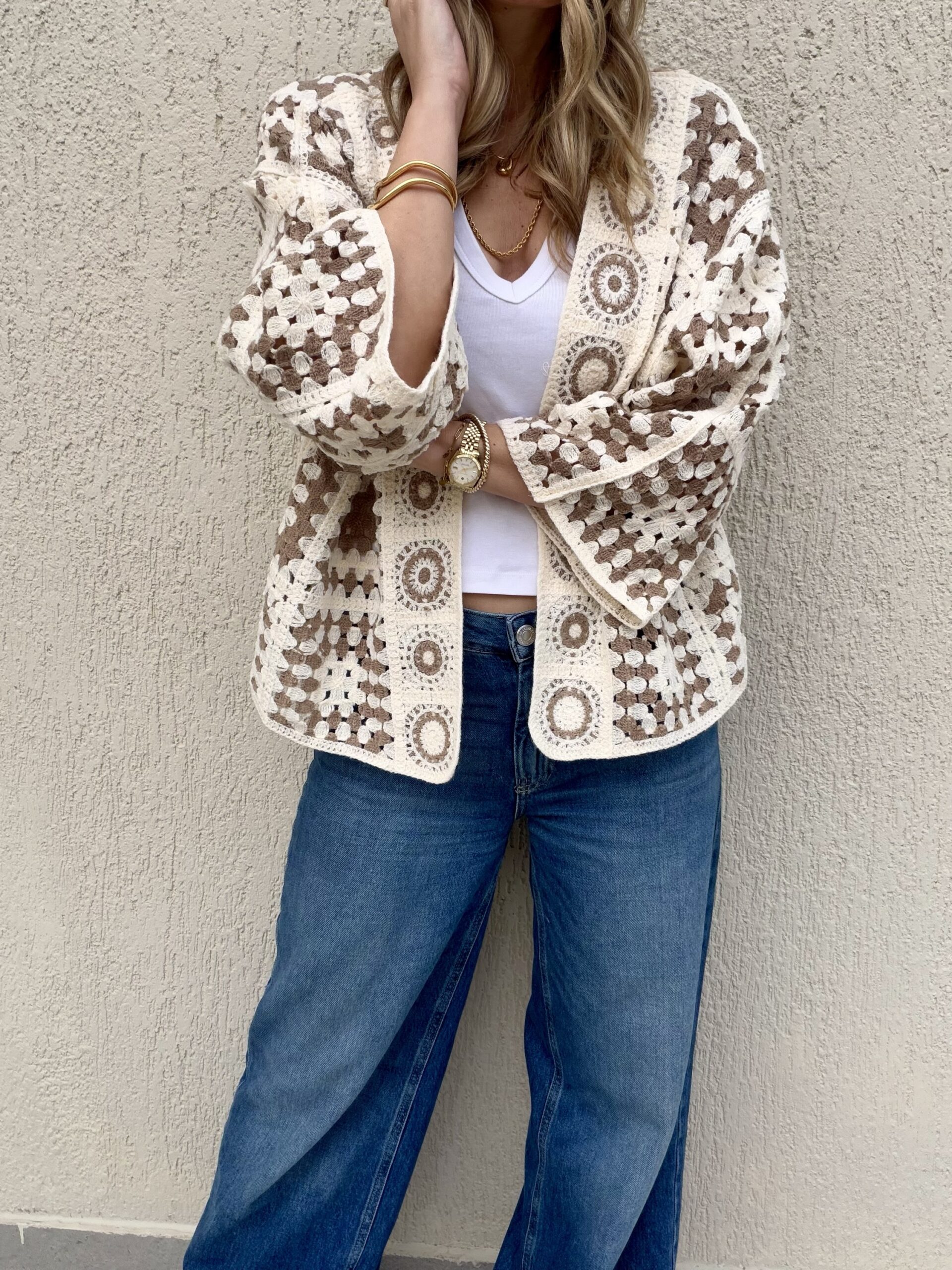 Statement cardigan σε συνδυασμό beige–brown, με ιδιαίτερο crochet σχέδιο που δίνει boho αλλά ταυτόχρονα κομψό χαρακτήρα.