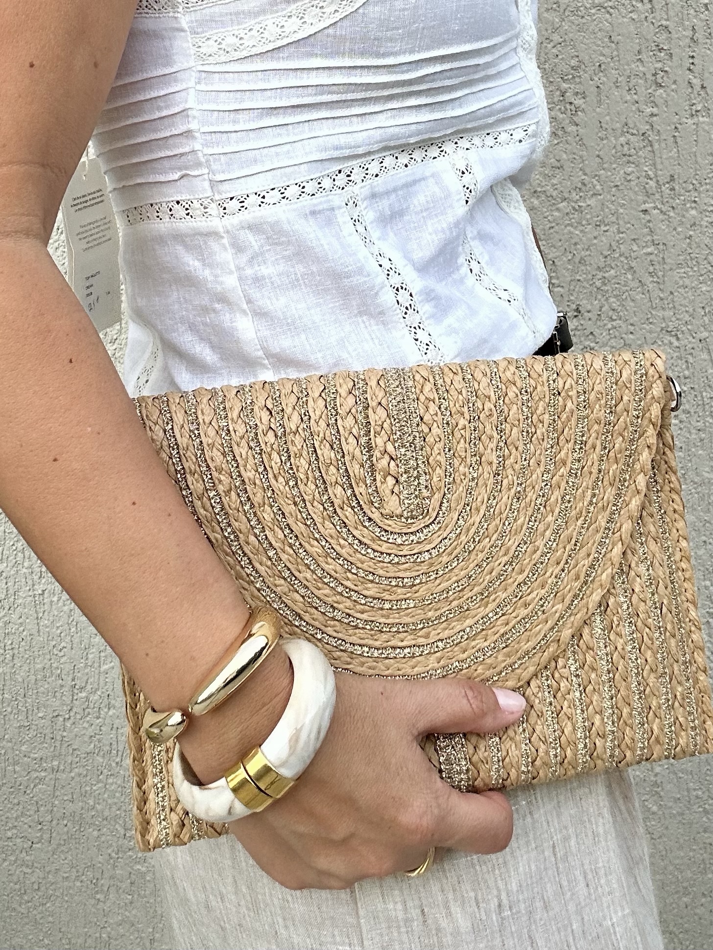 Ένα κομψό αξεσουάρ που θα απογειώσει τις εμφανίσεις σου. Με υφή ψάθας και χρυσές λεπτομέρειες σε κυκλικό μοτίβο, συνδυάζει φυσική αισθητική με glamorous αποτέλεσμα.