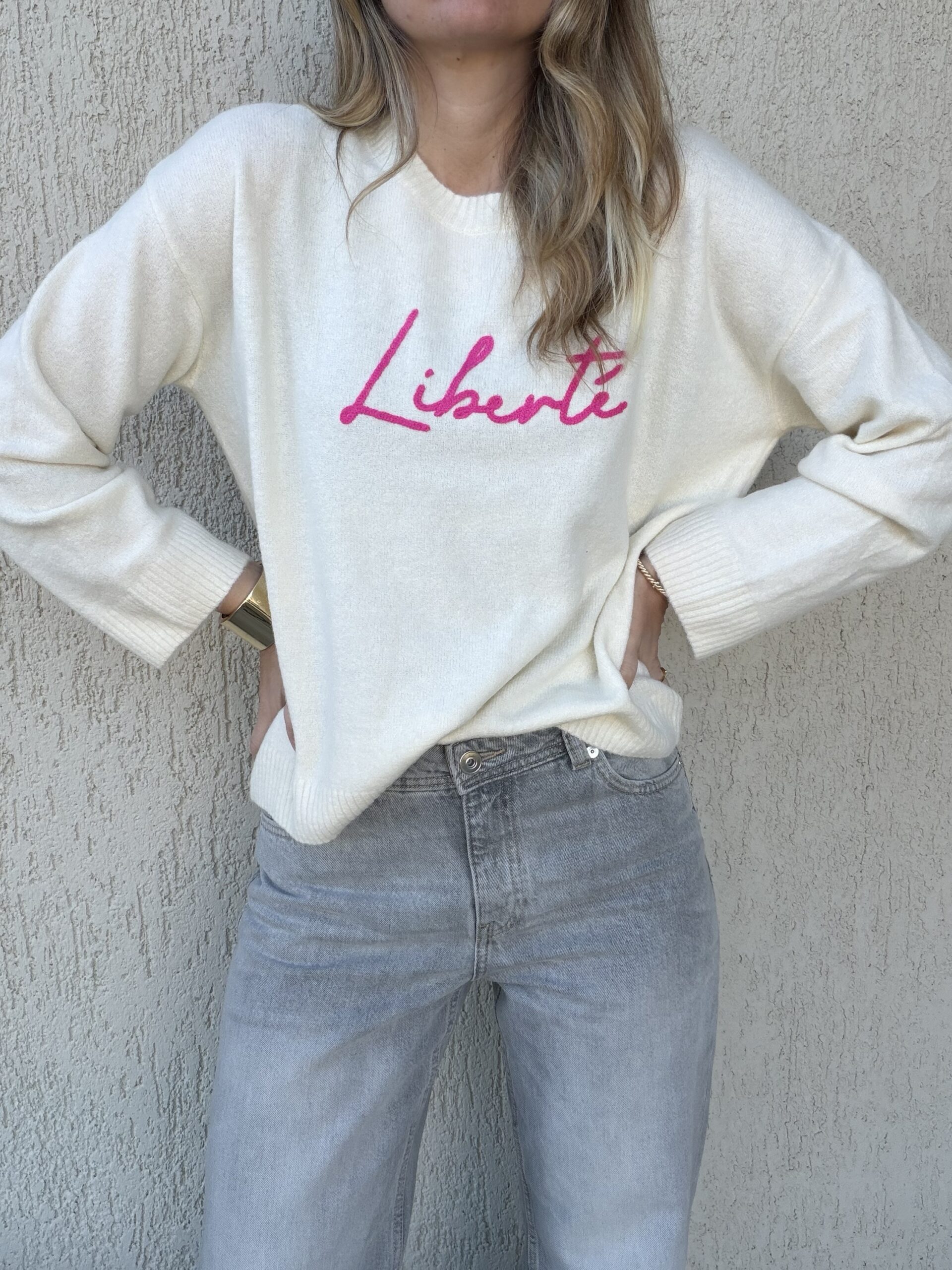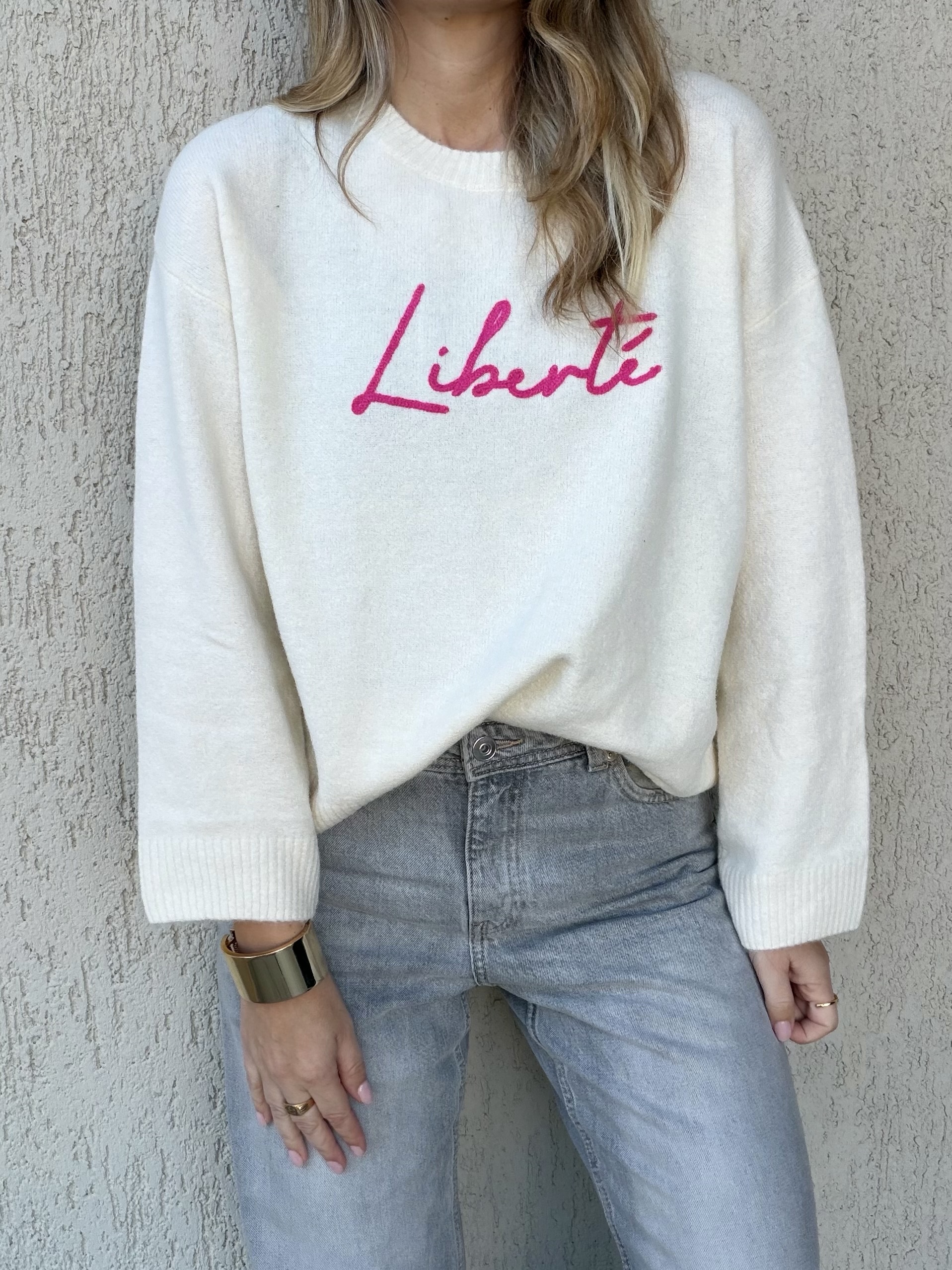 Πλεκτό σε off-white απόχρωση με κεντημένη επιγραφή “Liberté” σε φούξια.