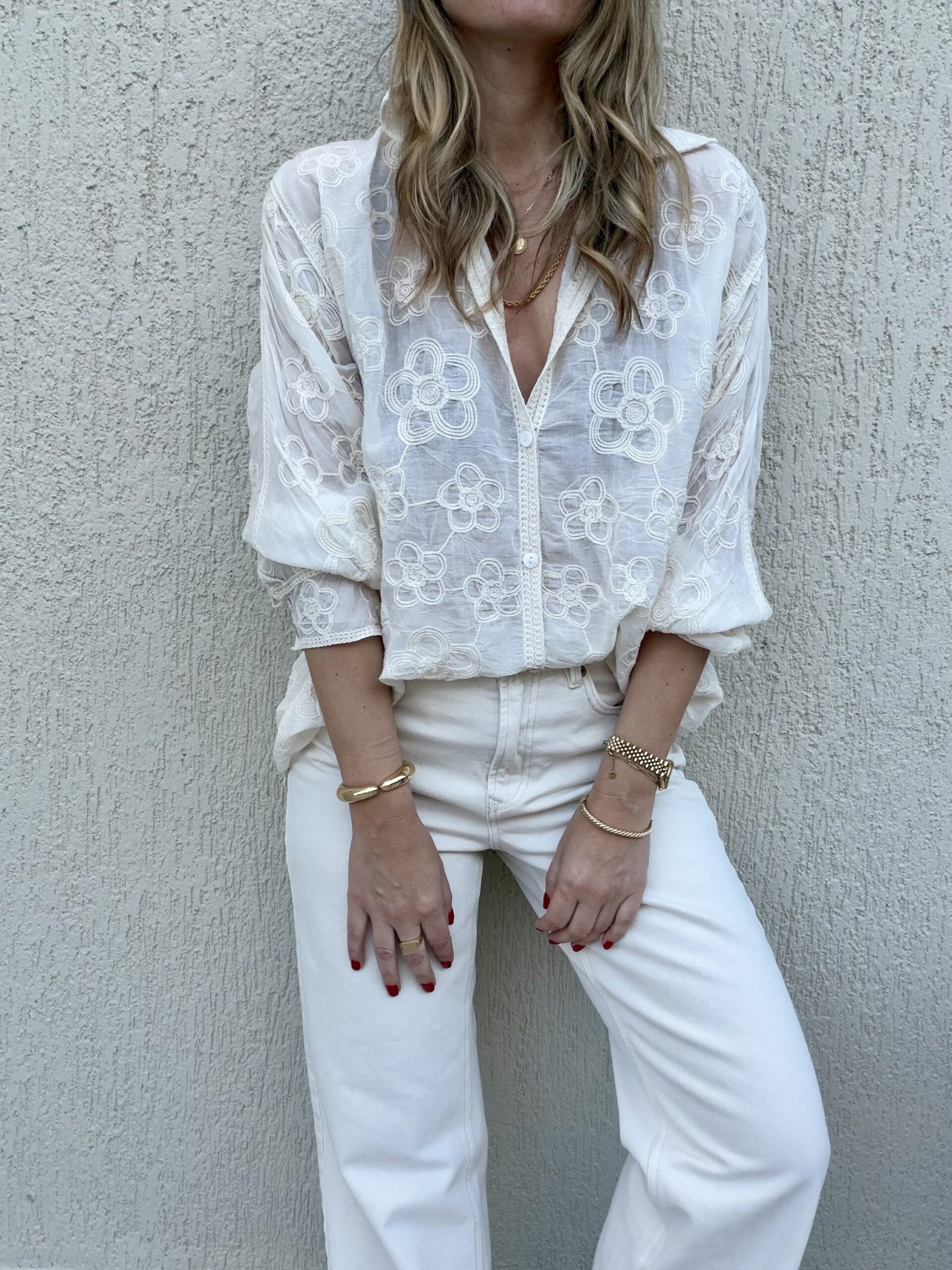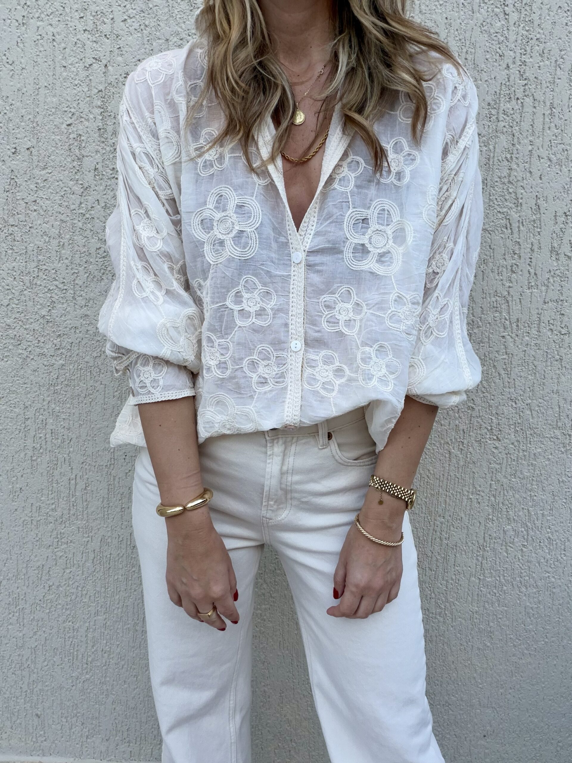 Λευκό πουκάμισο με διακριτικό floral κέντημα που δίνει ρομαντικό και ταυτόχρονα κομψό χαρακτήρα.