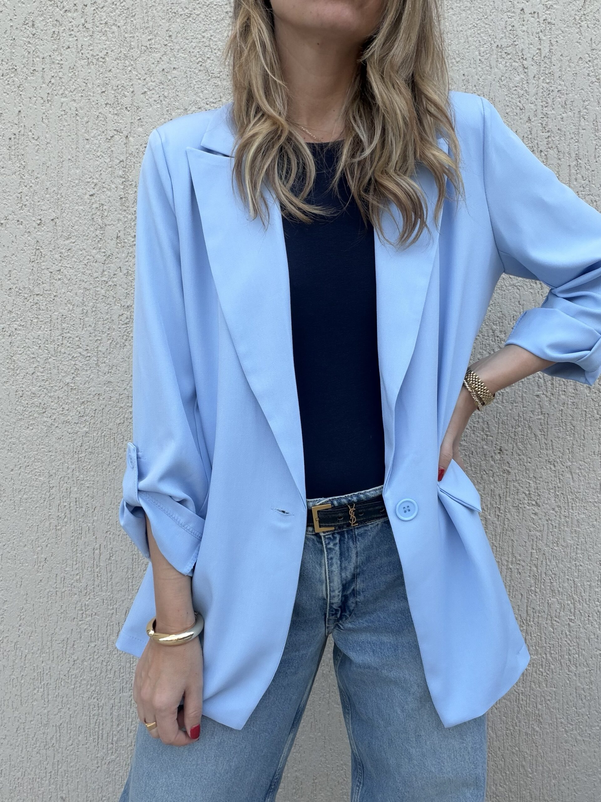 Κομψό blazer σε φωτεινή απόχρωση sky blue, που δίνει μια φρέσκια και σύγχρονη πινελιά σε κάθε σύνολο.