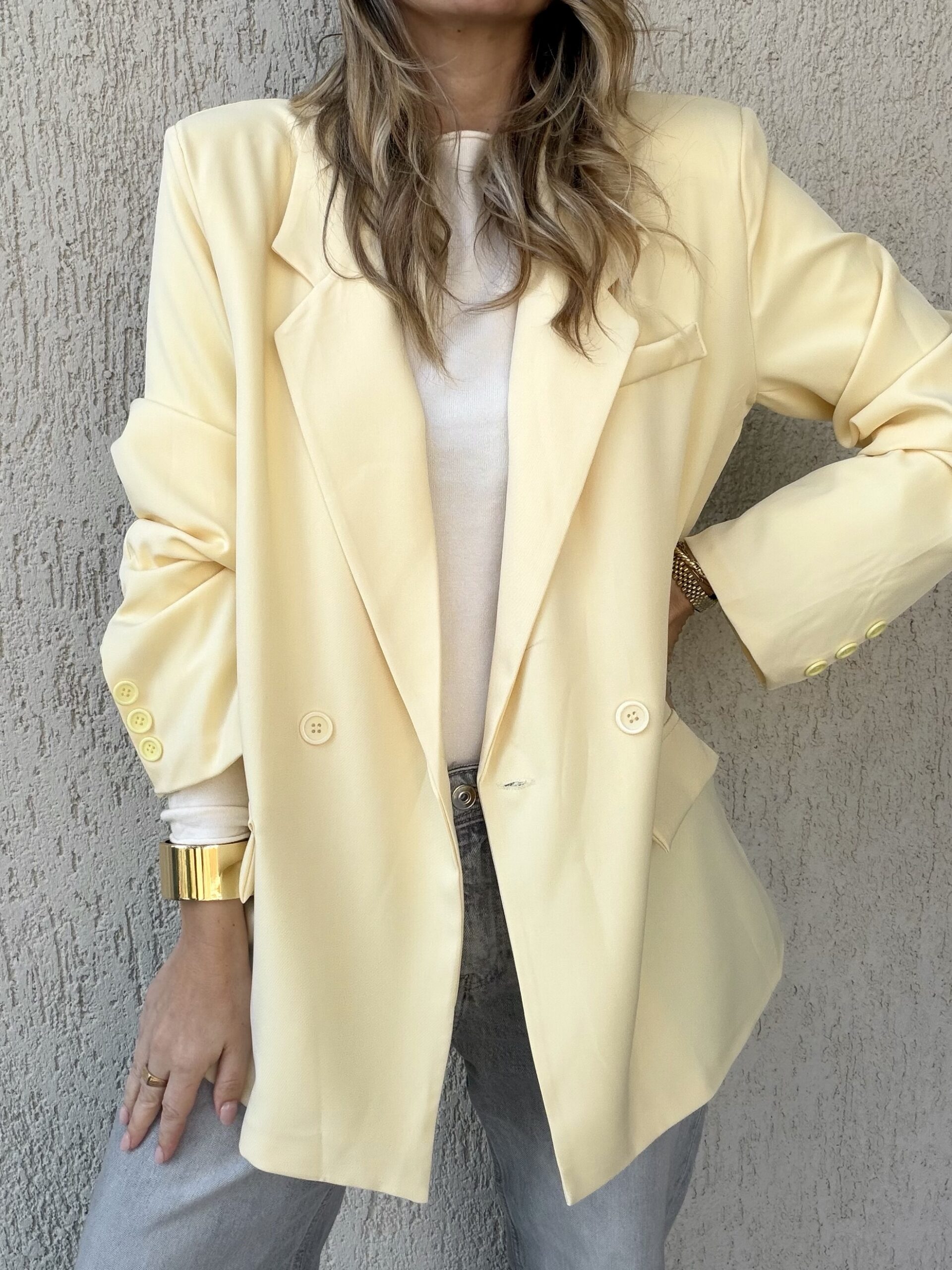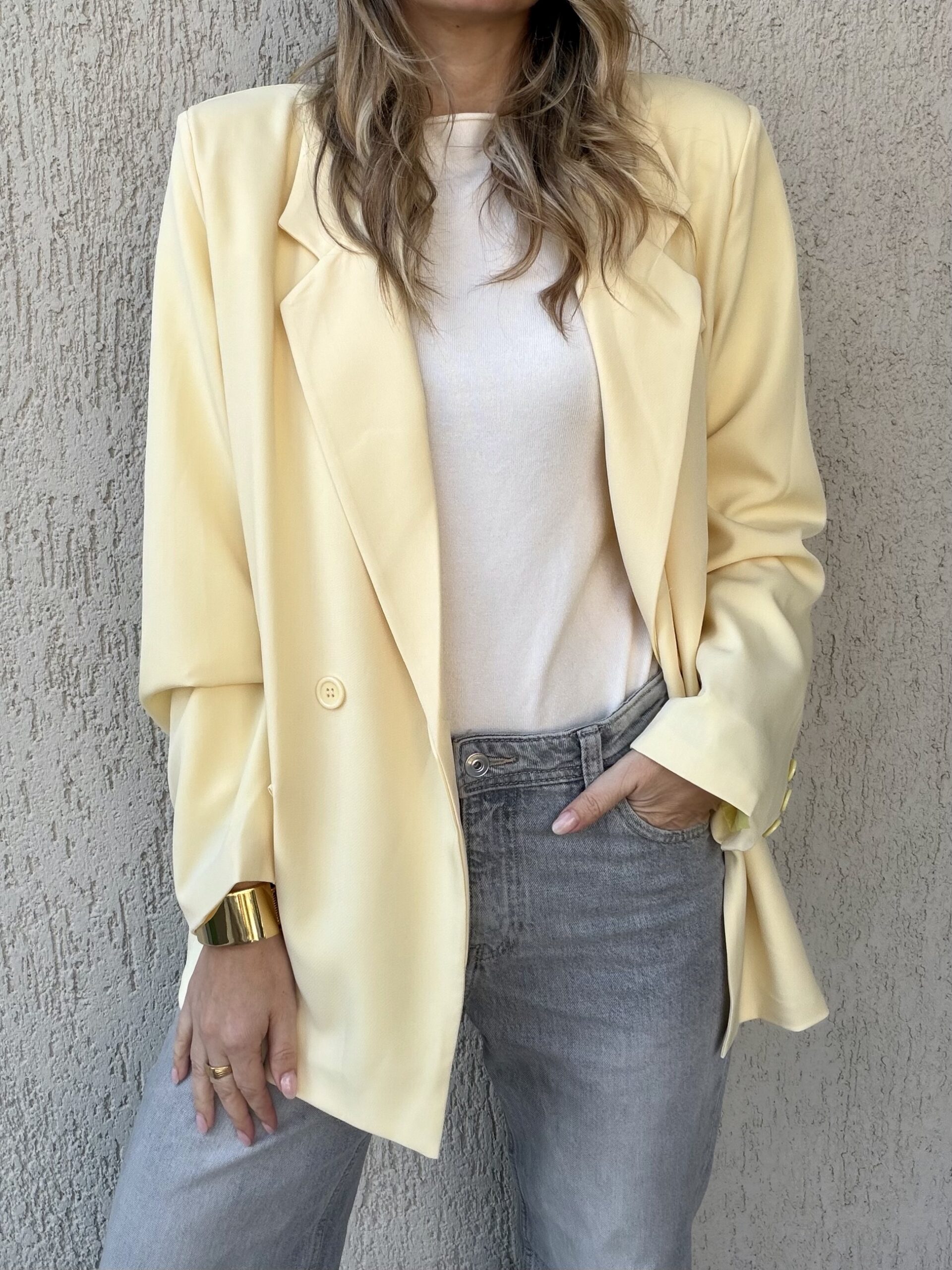 Elegant σακάκι σε παστέλ κίτρινη απόχρωση που φωτίζει το look και προσθέτει σύγχρονο χαρακτήρα σε κάθε εμφάνιση. Η oversized γραμμή του με το κλασικό πέτο και το διπλόκουμπο σχέδιο δημιουργούν ένα κομψό και δυναμικό αποτέλεσμα, ιδανικό για day-to-night outfits.