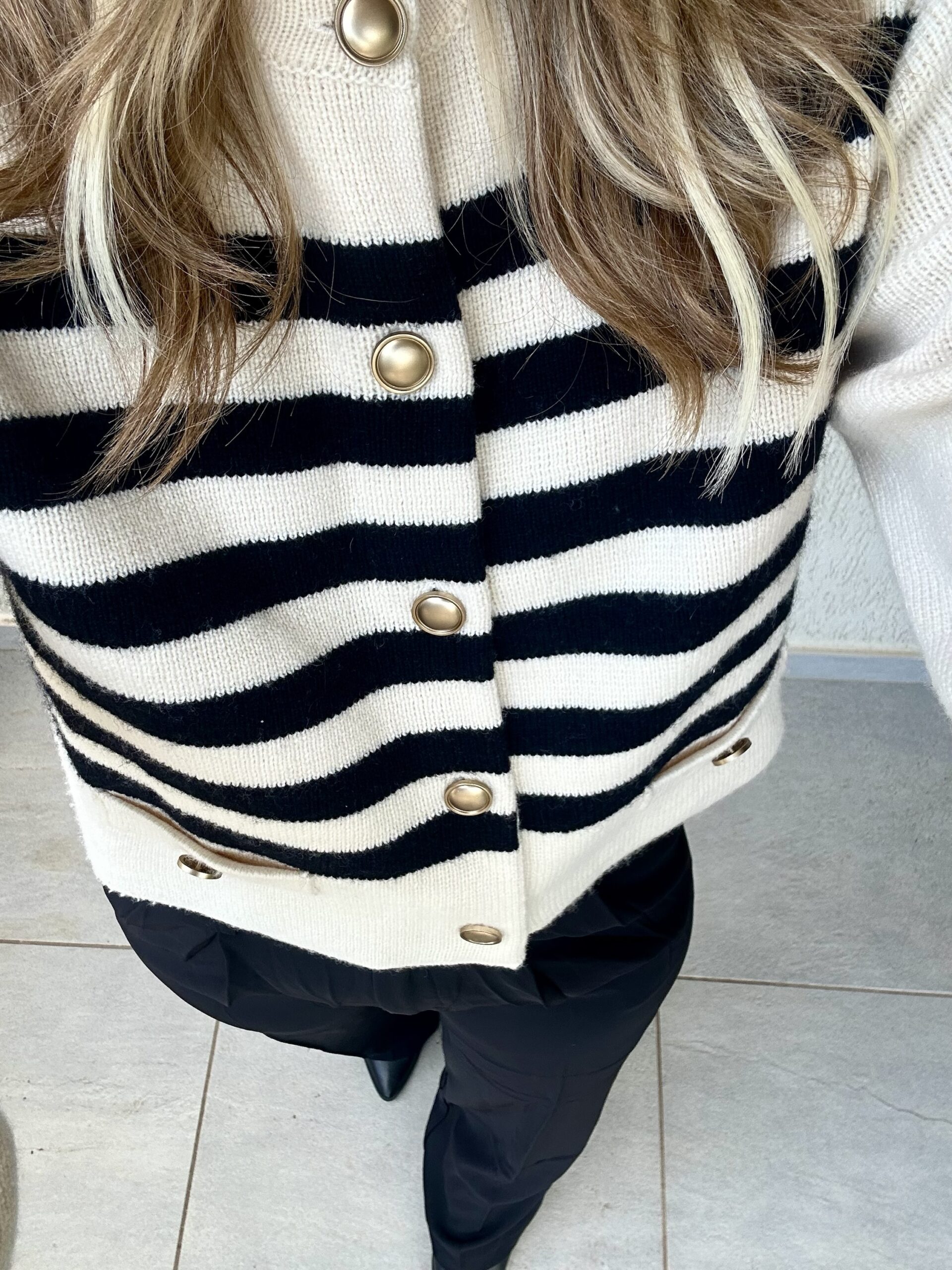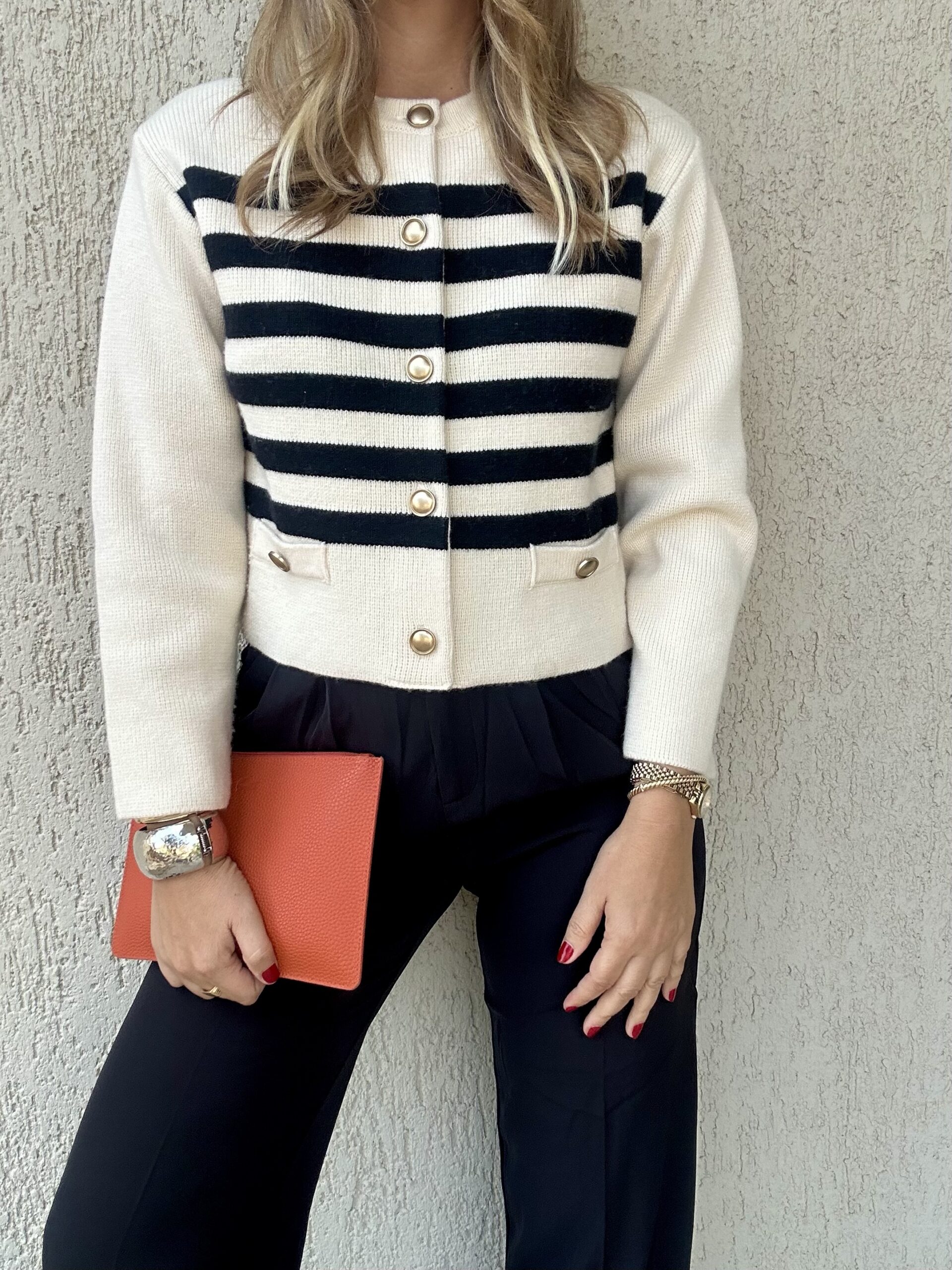 Cardigan με διαχρονικές μαρινιέρες σε navy & εκρού και χρυσά κουμπιά για απόλυτο French chic αποτέλεσμα.