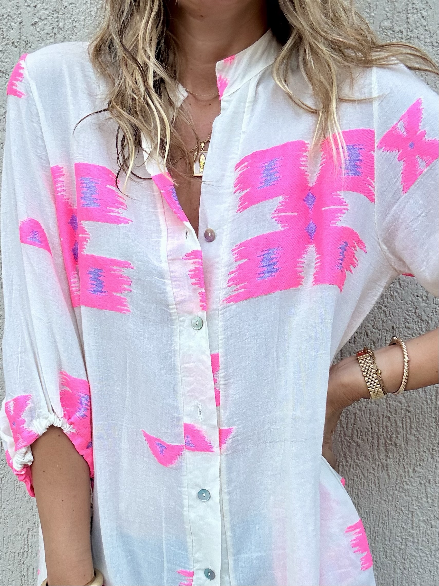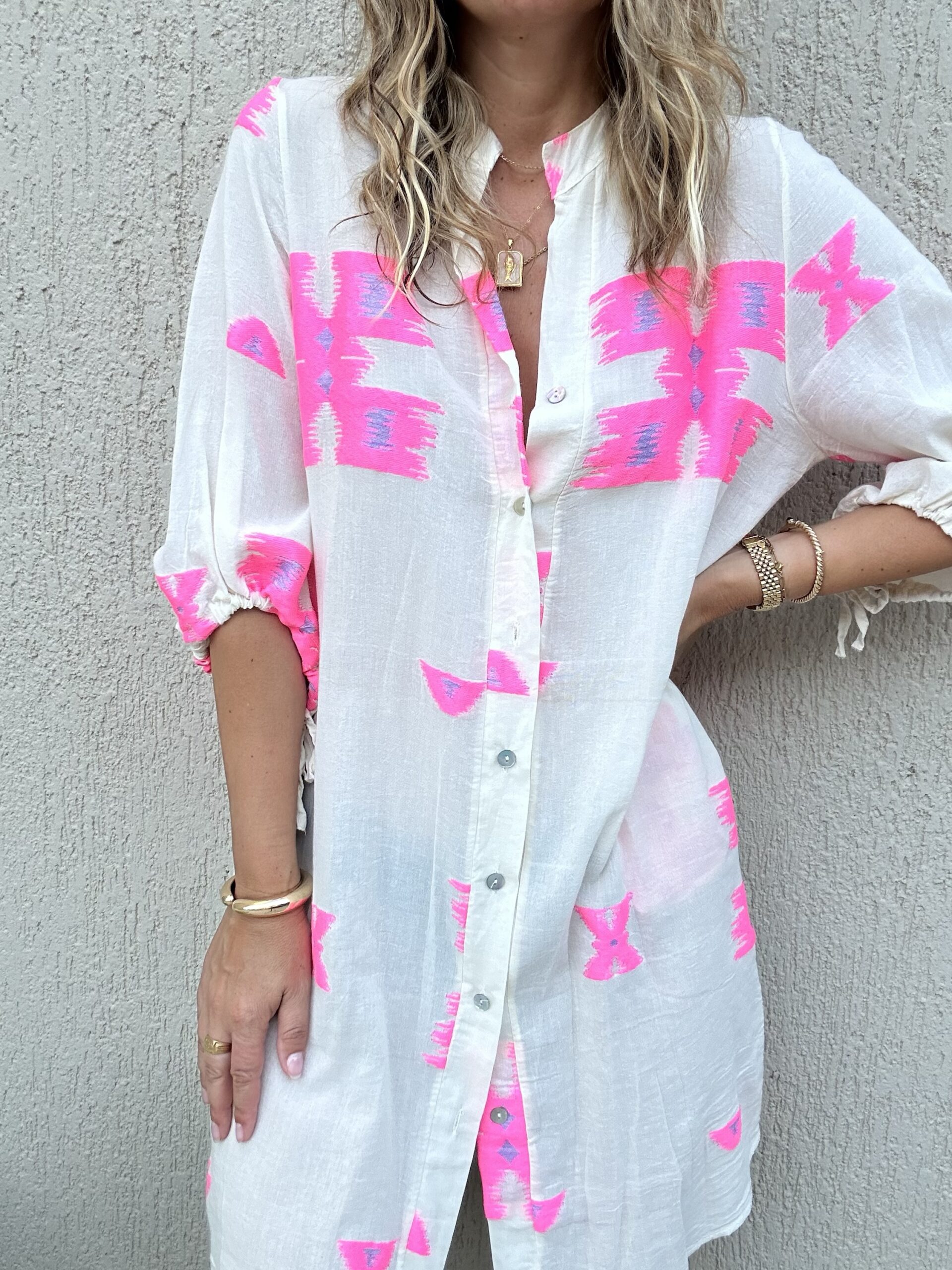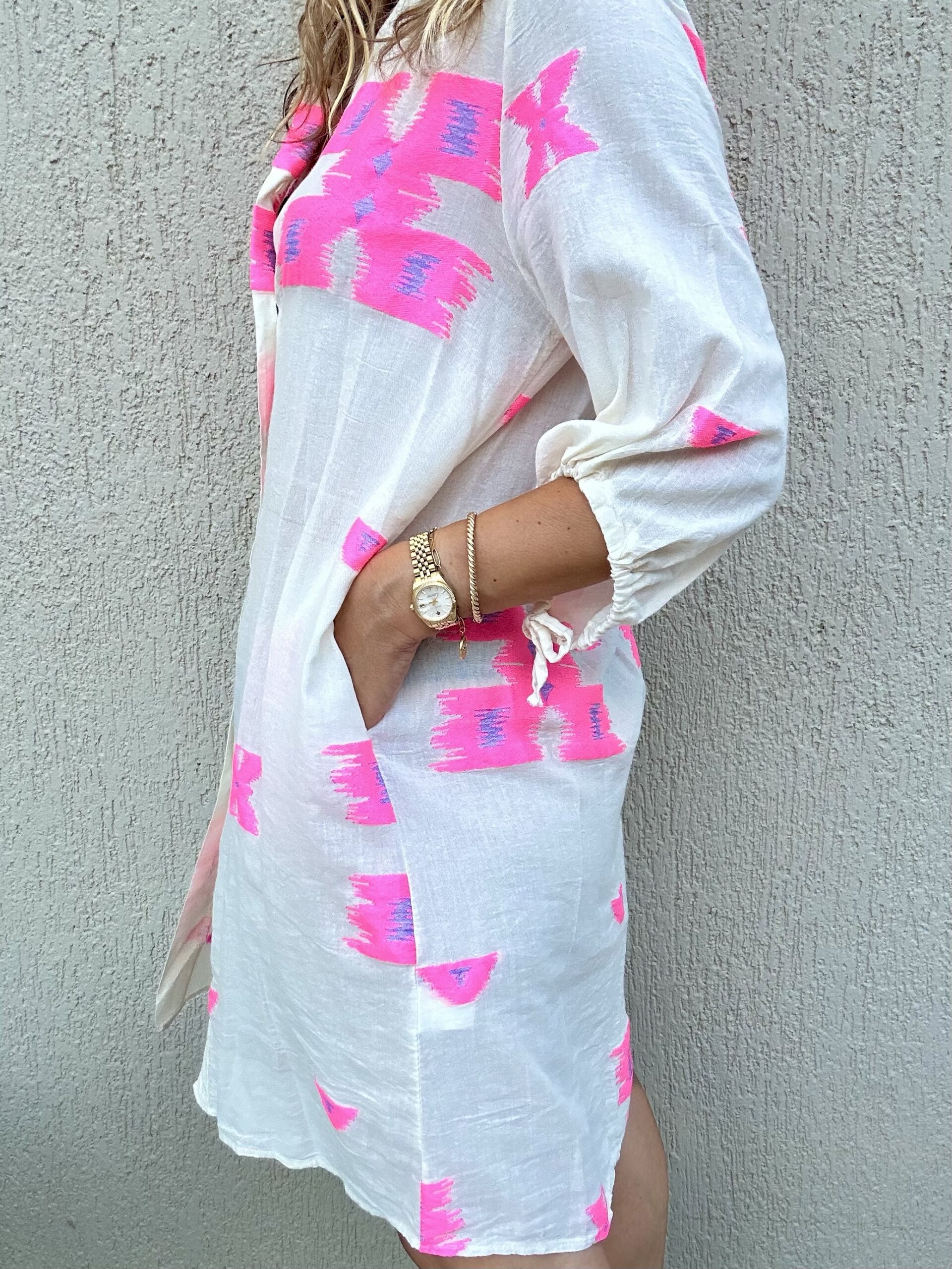 Το Maya είναι αέρινο κιμονό -καφτανι με φούξια αποχρώσεις για την παραλία.