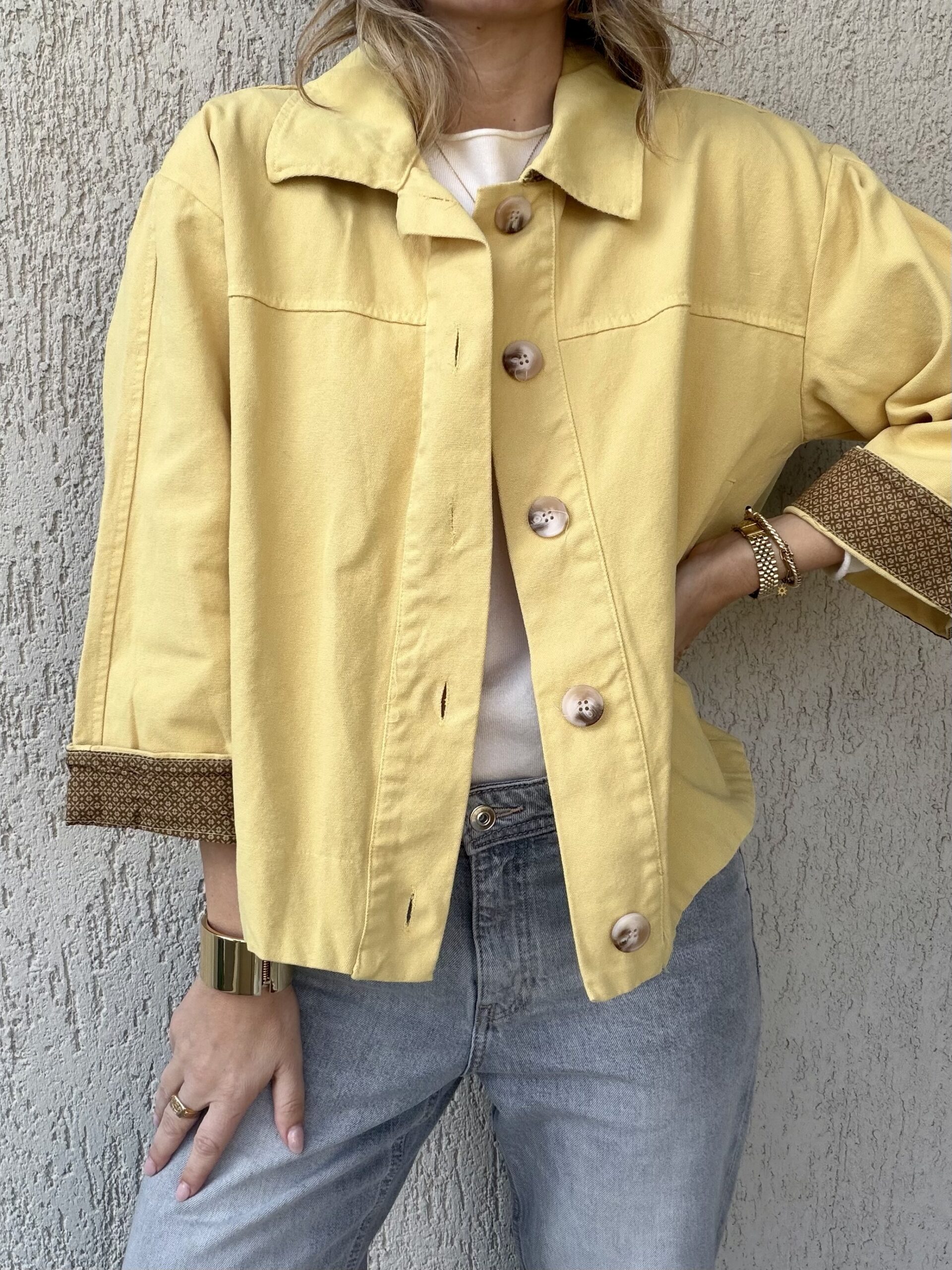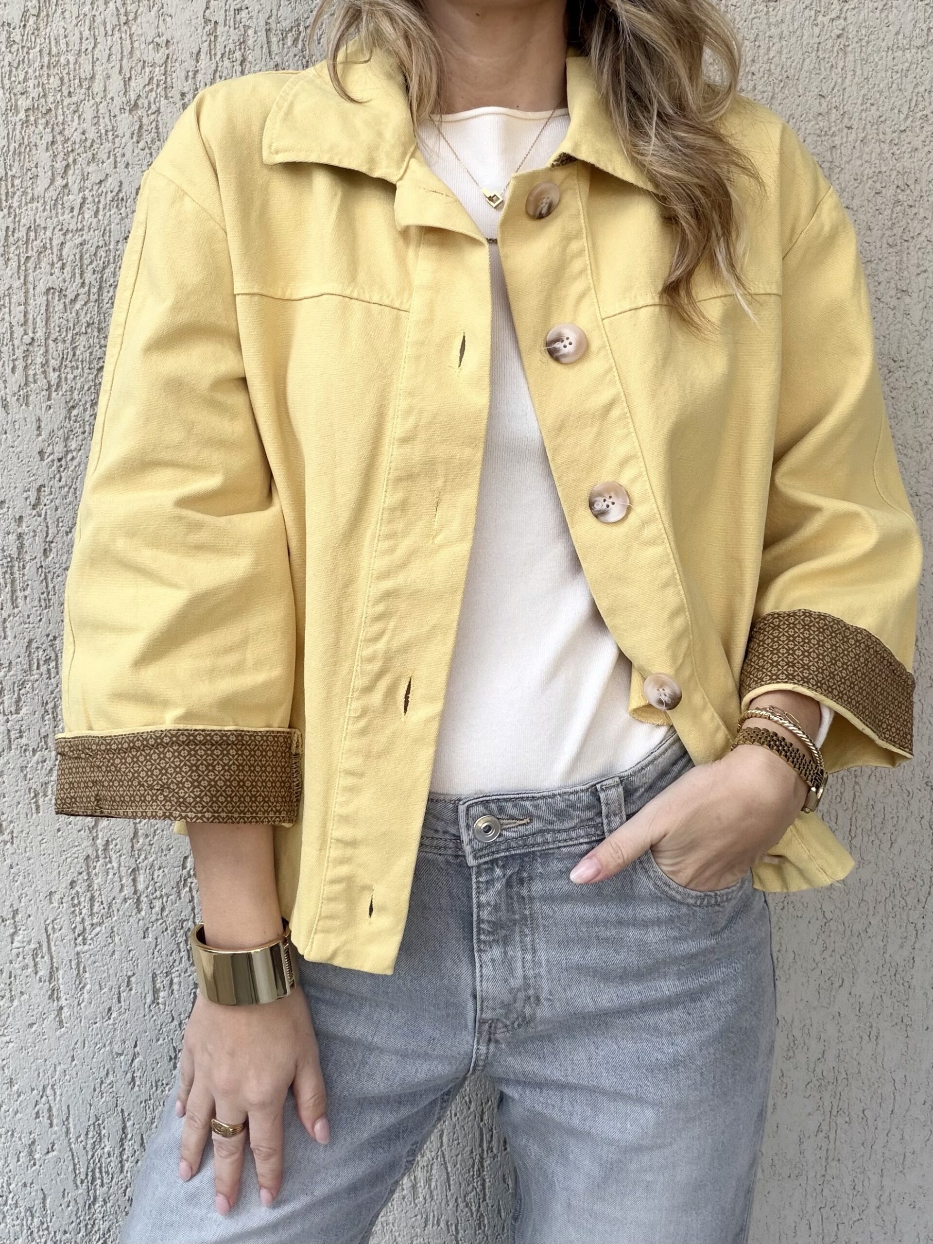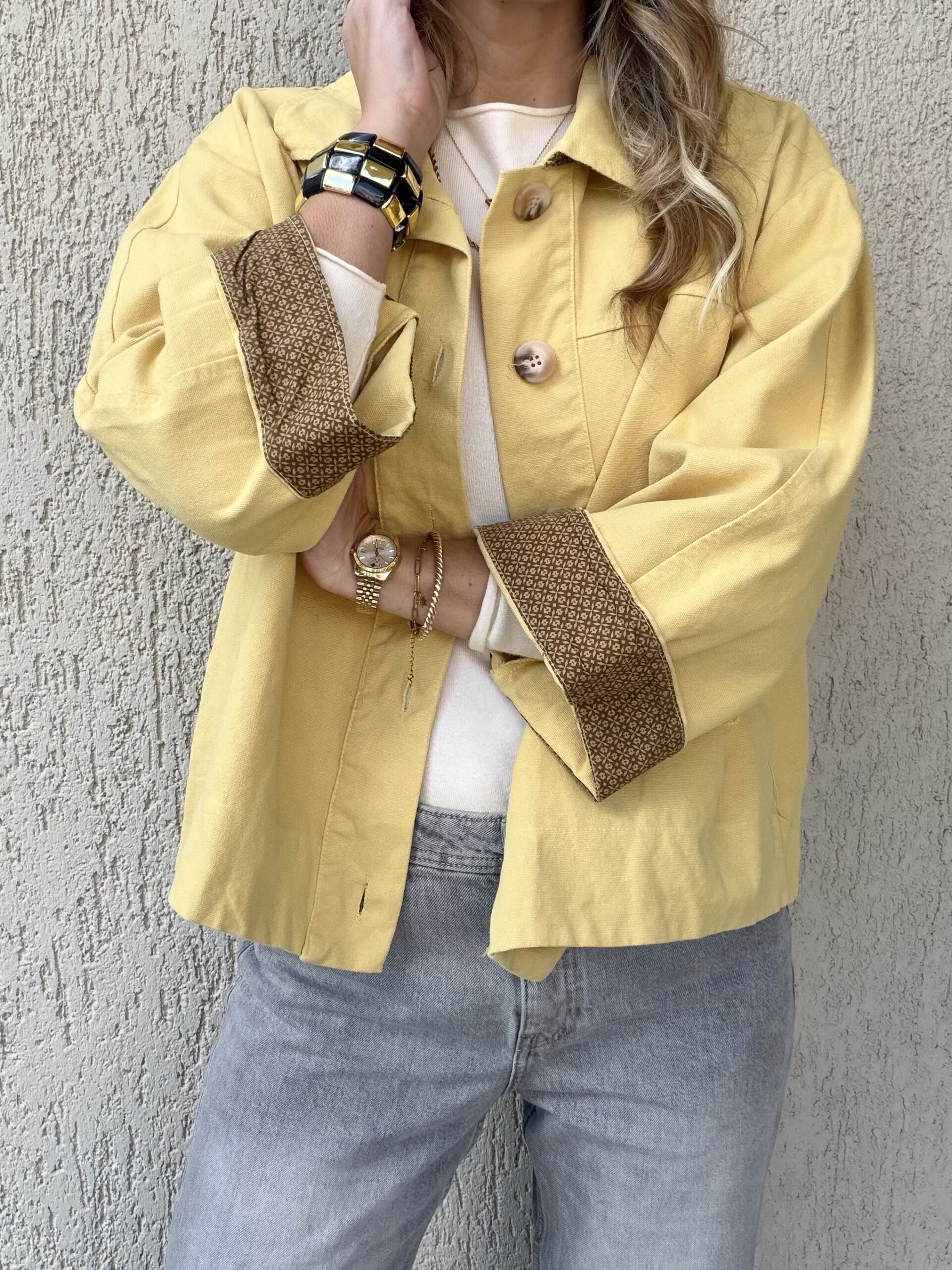 Τζιν jacket σε κίτρινο χρώμα που συνδυάζει το διαχρονικό denim ύφος με κομψές, σύγχρονες λεπτομέρειες. Η ίσια γραμμή του και το κλασικό πέτο δημιουργούν ένα effortless chic αποτέλεσμα, ενώ τα γυρισμένα μανίκια με το διακριτικό patterned τελείωμα προσθέτουν ξεχωριστό χαρακτήρα στο look.