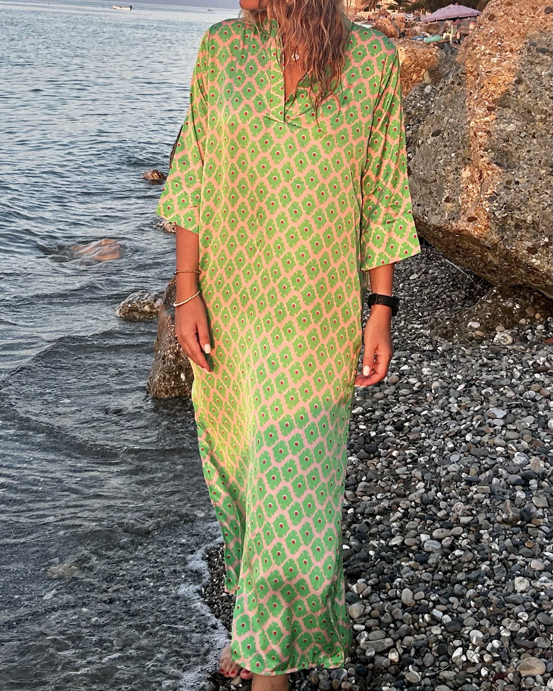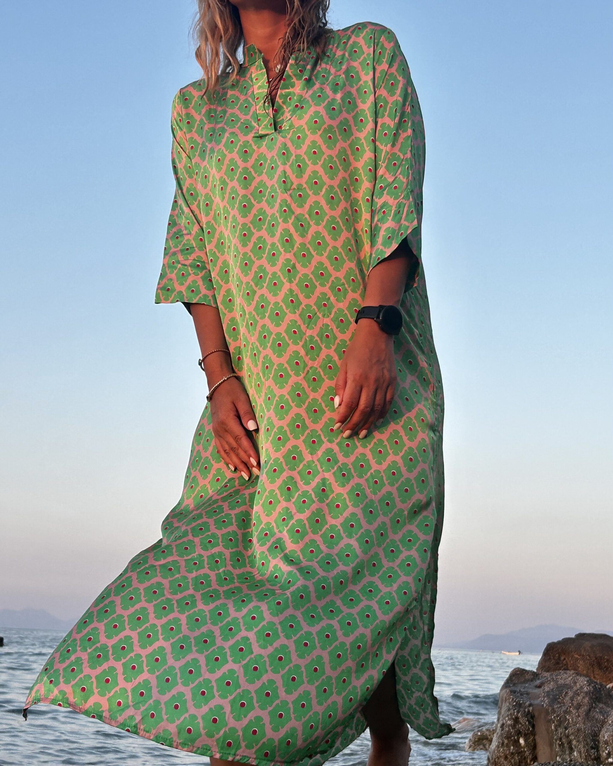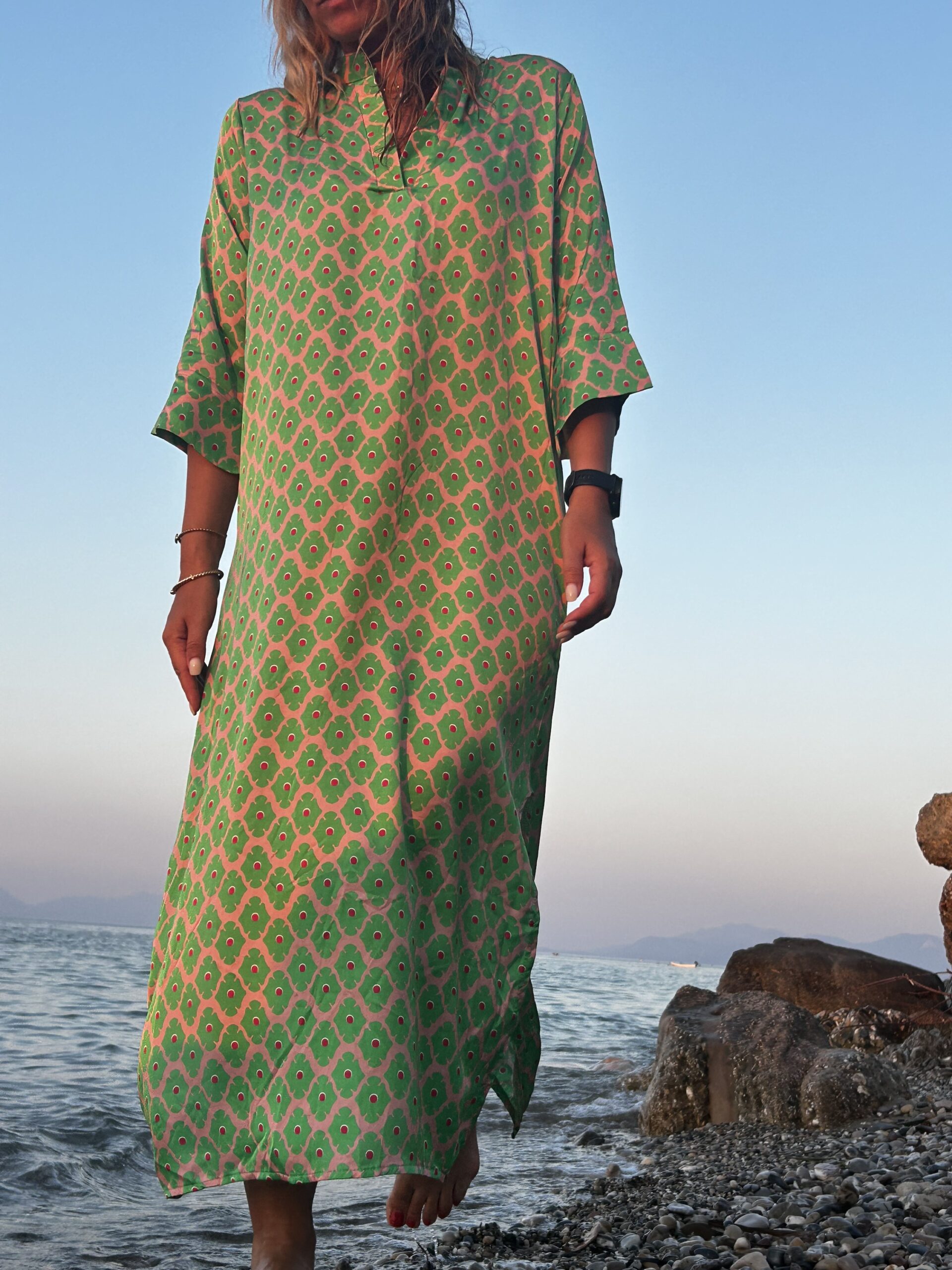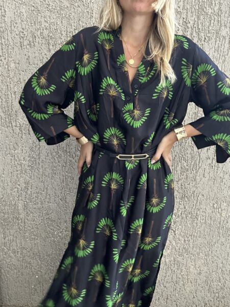 Μακρύ φόρεμα – καφτάνι με prints 100 % βισκόζη One size καλύπτει small έως large Η ζώνη δεν συμπεριλαμβάνεται