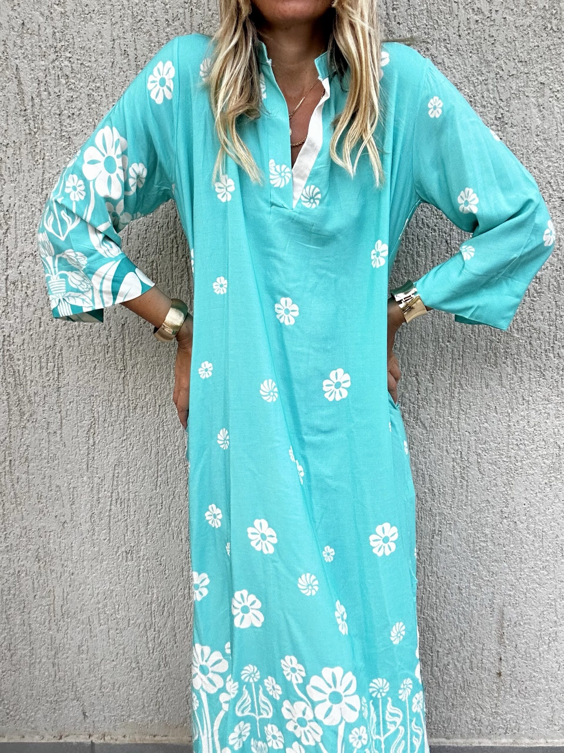 Μακρύ φόρεμα – καφτάνι με prints 100 % βισκόζη One size καλύπτει small έως large Η ζώνη δεν συμπεριλαμβάνεται